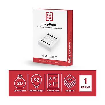 Take on your everyday printing with this TRU RED 8.5 x 11 white printer paper. Ensure all jobs print clearly every time with this pack of white printer paper. Engineered to prevent jamming in your machines, this letter-size paper is an ideal option for every day home and office printing. The 92 brightness rating and 20 lb. paper weight works well with black and white printing, providing a crisp backdrop for text and images. Featuring 500 sheets per ream, this Tru Red 8.5 x 11 white printer paper delivers the right amount of paper for your everyday printing needs. - Copy printer paper that is best for high volume, black & white printing - Paper weight: 20 lbs. - Sheet Dimension: 8.5W x 11L (US Letter) - Brightness rating of 92 for sharp, clear print results - White paper with a Matte finish - 500 sheets per ream - Paper is acid-free to prevent crumbling or yellowing - Engineered to prevent jamming - Designed for high-speed printers - Packaging may vary - Safety Data Sheet