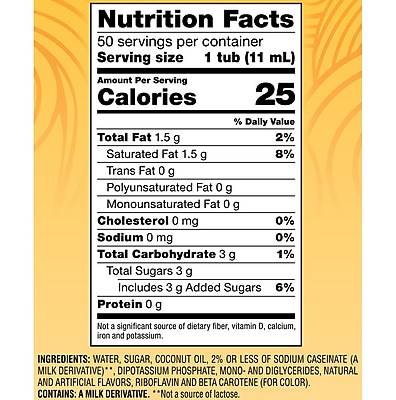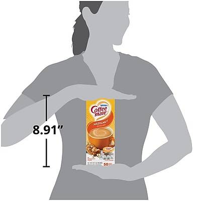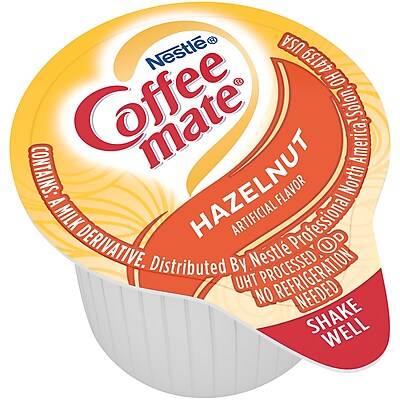 Brighten up your colleagues' workday by slipping this tasty hazelnut Nestle Coffee-mate coffee creamer into the office break room. Add Nestle Coffee-mate hazelnut-flavored coffee creamer to your coffee for a nice change from ordinary cream. This liquid lactose-free creamer dissolves rapidly and comes in individual singles so you can use as few or as many as you want. Keep the break room well-stocked with Nestle Coffee-mate hazelnut-flavored coffee creamer with this convenient 50-pack. - Liquid creamer that adds a rich sweetened creamy flavor to coffee beverages - Great-tasting hazelnut flavor - Contains 50 individual 0.38 oz. cups - Gluten-free - No cholesterol - Lactose-free - Product is kosher - Ingredients: water, sugar, coconut oil, sodium caseinate (a milk derivative), dipotassium phosphate, mono- and diglycerides, natural and artificial flavors, artificial colors - Nutrition Facts