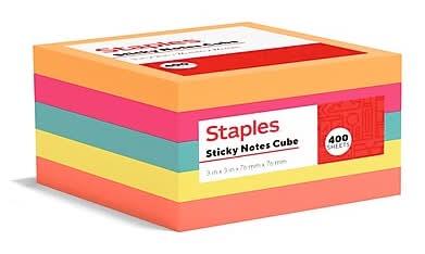 Make message-taking and other note-taking simple with this Staples 3 x 3-inch bright assorted-color notes cube. Ensure messages don't get forgotten with this bright assorted-color notes cube. The specially formulated adhesive lets them stick to paper and almost any other hard surface, and the small notes can be removed without leaving behind any residue, saving you from a tedious cleanup task. This Staples bright notes cube uses paper that comes from well-managed forests where trees are replanted, making it a smart choice for supporting sustainable paper. - Use the self-adhesive notes to stick them on papers, desks, and other places where you need - 3 x 3 notes are just the right size to leave reminders on your computer monitor - They come in a pack of 400 - Flat pads are perfect for on-the-go use - Unlined notes give you room to express yourself