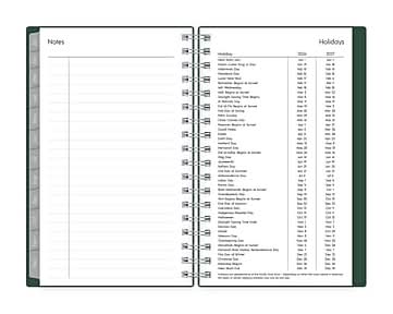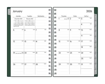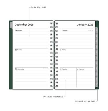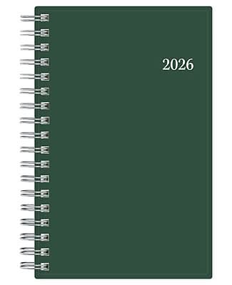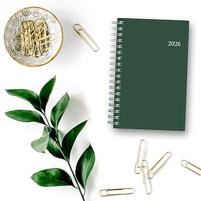Swap your smartphone for a pocket planner that fits in your coat or bag. Stay up to date with a tiny 2026 planner that fits in your pocket. This spiral-bound planner has weekly and tabbed monthly calendars so that you can track tasks, birthdays, and appointments. Pages are lined for the easiest writing. - Calendar Year 2026, January 2026 - December 2026 Planner - Dimensions: 6.125 inches x 3.625 inches - Weekly Monthly Format - Start month: January 2026 End month: December 2026 - Deep Forest Green flexible plastic cover - Polypropylene flexible plastic cover; paper - Weekly layouts; monthly views - Yearly overview - Goals, contacts, important dates pages