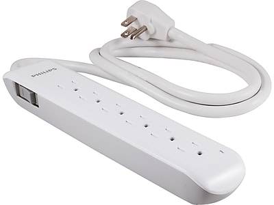 Your power does more with the Philips 6-outlet surge protector. Converting one outlet into six, this powerful extension cord adds more outlets where you need them most and keeps your electronics protected from dangerous power surges. The surge protector features an integrated circuit breaker that protects your electronics if the capacity is exceeded by a power surge and automatic shutdown technology to cut power if the components expire. It also features a surge protection rating of 720 joules to ensure your electronics are safeguarded from voltage spikes. The surge protector's extra-long 4' heavy-duty power cord is connected to a flat plug, allowing it to plug in easily behind desks, sofas, and other furniture. Featuring a durable construction and sophisticated white finish, the power cord increases the cable's durability and blends in with existing décor. - Keep the equipment and data protected from power spikes with this surge protector - Extend the use of your wall outlet with the Philips surge protector with its six protected three-prong outlets - 4' extra-long, heavy-duty extension cord gives you the freedom to plug in devices from almost anywhere in your home or office, including behind furniture, thanks to the space-saving flat plug - Featuring a surge protection rating of 720 joules, an integrated circuit breaker and automatic shutdown technology, this extension cord is the ultimate in protection from voltage spikes and circuit overloads - Sleek white finish of this surge protector blends seamlessly into your existing décor and adds to the aesthetics of any room - This unit is backed by a $75000 connected equipment replacement policy for peace of mind as well as by the highest industry standards of safety and performance