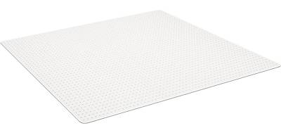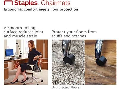 Extend the life of your low-pile carpet (up to 3/8 thick including padding depth) by protecting against chair caster wear and tear. A perfect addition to your workspace, this Staples chair mat provides a smooth surface that enhances ergonomic comfort by allowing your rolling office chair to move freely. Easy to handle, this chair mat features rounded AnchorBar cleats (studs) that hold your mat in place and are gentle on carpets and fingers (no sharp spikes). Made with durable vinyl that is GREENGUARD Gold certified for low chemical emissions to promote a healthier workspace. Designed for use on carpeted surfaces only, do not use on hard floors. - Comes in a rectangular shape for a larger rolling area and measures 46 x 60 - Made of clear vinyl to allow the beauty of your floors to show through - Protects low-pile carpets up to 3/8 thick (including padding depth) from chair caster wear and tear - Features rounded AnchorBar cleats (studs) that are gentle on carpets and hands (no sharp spikes) - Meets or exceeds the GREENGUARD Gold standards - Move freely with a smooth rolling surface for less stress on your legs and back - Made in USA