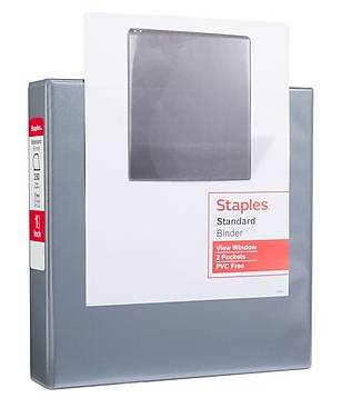 Get easy access to documents by storing them in this grey view binder. The 1.5 D-ring design allows pages to lie flat, making them easier to write on. This Staples standard view binder can hold up to 375 sheets of paper and has two interior pockets for storing loose pages. - Standard gray view binder is an excellent choice for storing spreadsheets and other wide papers - 1 1/2 inch binder - Dimensions: 11.56L x 11.12H x 2.25W - Three D-Rings keep pages secure - Holds up to 375 sheets - Accommodates 8.5 x 11 letter-sized papers - Durable covers are made of vinyl - Two interior pockets for added organization