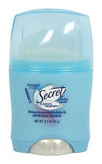Flawless renewal invisible solid antiperspirant & deodorant contains Aluminum zirconium trichlorohydrex gly. The Secret Flawless Renewal 0.5 oz protecting powder sent invisible solid antiperspirant & deodorant offers you ultimate odor and wetness protection for longer duration. This invisible solid antiperspirant & deodorant contains aluminum zirconium trichlorohydrex gly active ingredient that has the ability to obstruct pores in the skin and restricts sweat from leaving the body. - Size: 0.5 oz - Scent: Protecting powder - Active ingredient: Aluminum zirconium trichlorohydrex gly Safety Data Sheet
