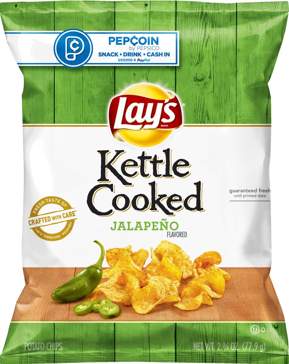 LAY'S Kettle Cooked Jalapeño potato chips combine the delicious goodness of farm-grown potatoes with the fiery wallop of real jalapeños. In other words, be careful not to rub your eyes. Yes, they're tasty, but make no mistake: they mean business. • Flavor: Jalapeño • Number of servings: 3 • Frito-Lay Inc, Plano, TX, 75024-4099.