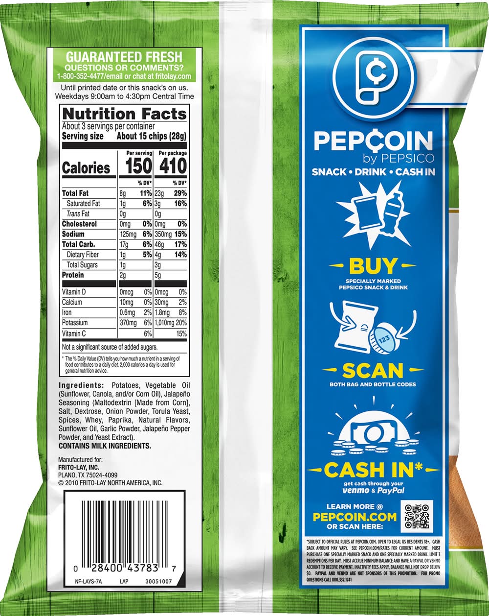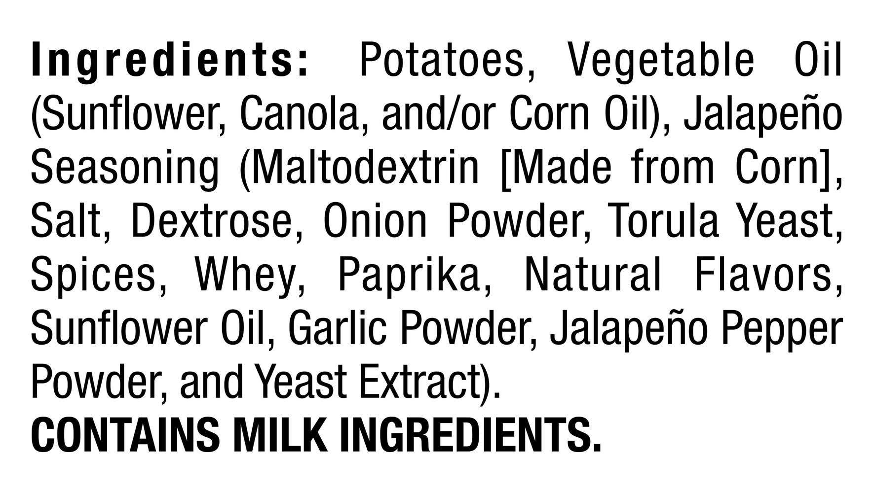 Ingredients: Potatoes, Vegetable Oil (Sunflower, Canola, and/or Corn Oil), Jalapeno Seasoning (Maltodextrin [Made from Corn], Salt, Dextrose, Onion Powder, Torula Yeast, Spices, Whey, Paprika, Natural Flavors, Sunflower Oil, Garlic Powder, Jalapeno Pepper Powder, and Yeast Extract) Contains: Milk, Corn
