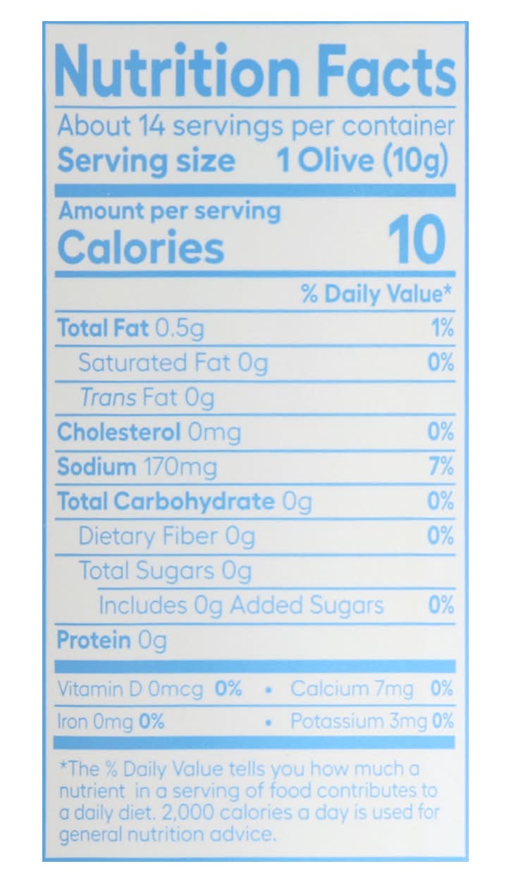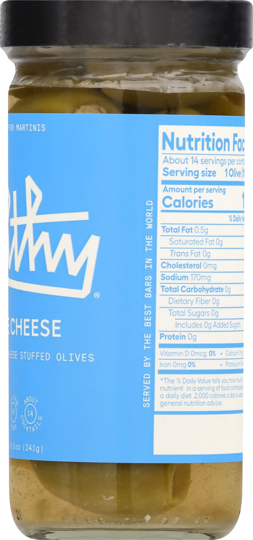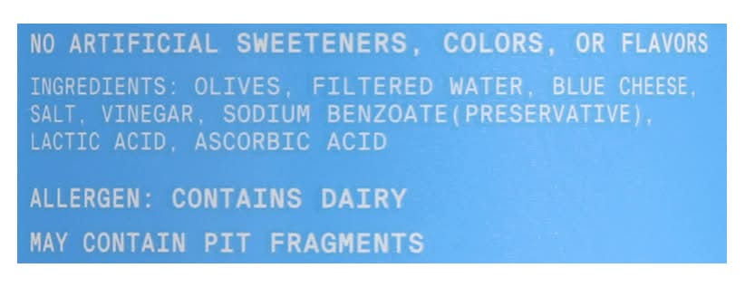 Ingredients: Olives, Filtered Water, Blue Cheese, Salt, Vinegar, Sodium Benzoate (Preservative), Lactic Acid, Ascorbic Acid Contains: Milk