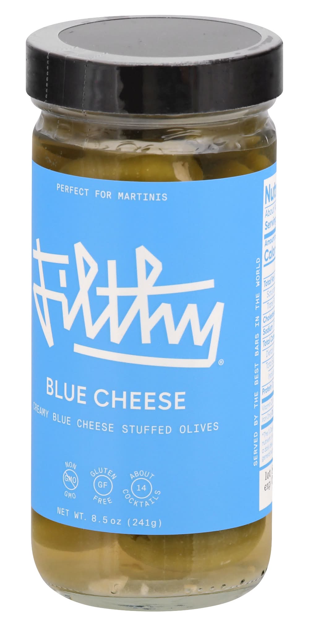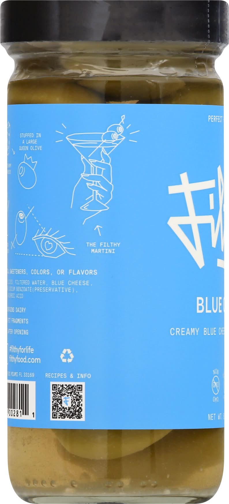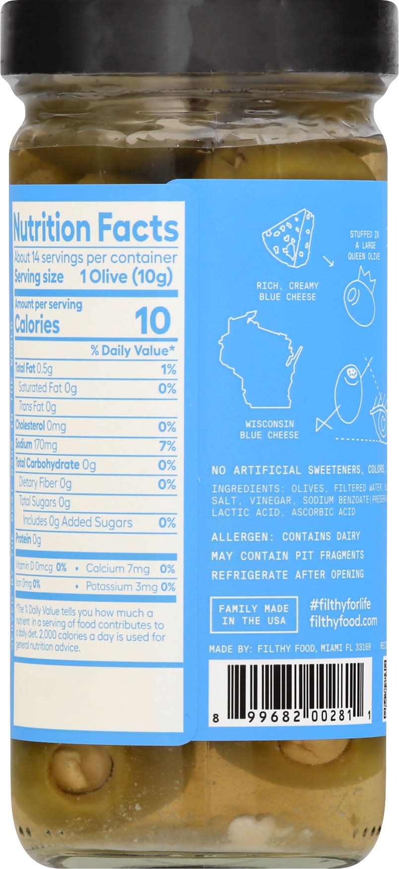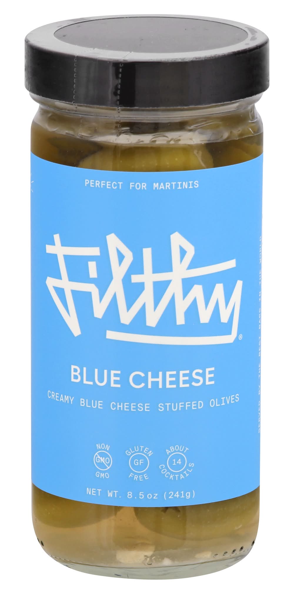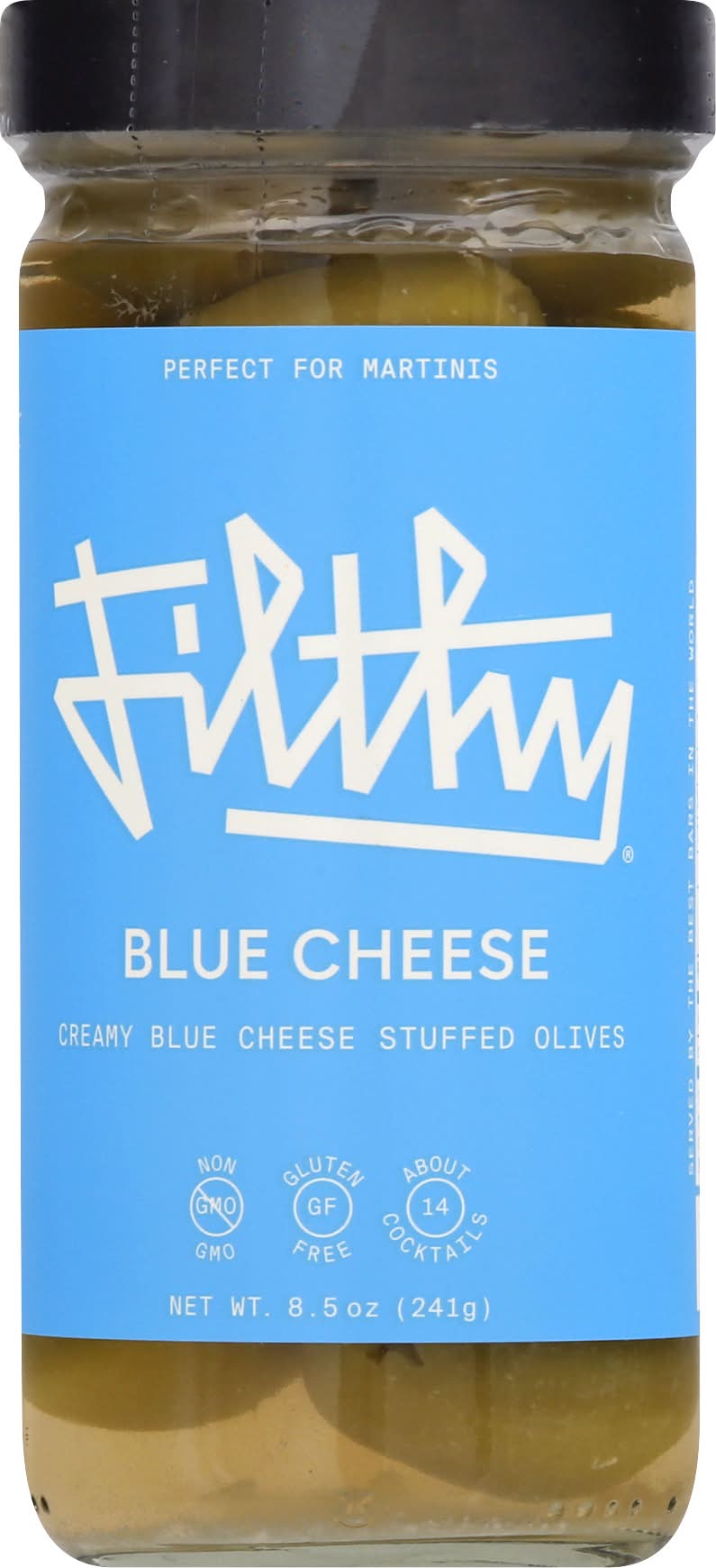 Creamy blue cheese stuffed olives. No artificial sweeteners, colors, or flavors. Gluten free. Non GMO. Perfect for martinis. About 14 cocktails. Rich, creamy blue cheese. Stuffed in a large queen live. Wisconsin blue cheese. The filthy martini. Served by the best bars in the world. • Brand: Filthy • Flavor: Blue cheese • gluten-free, GMO-free • Filthy Foods, Miami, FL. • Packaging: Reusable