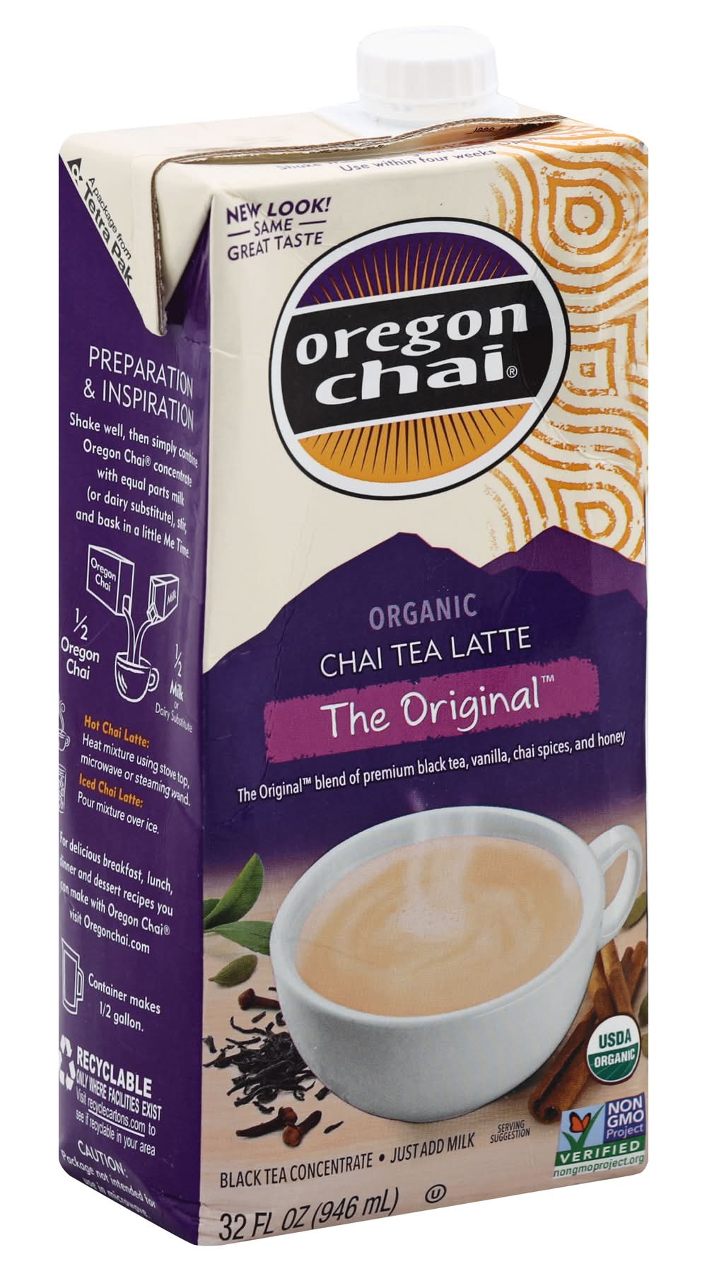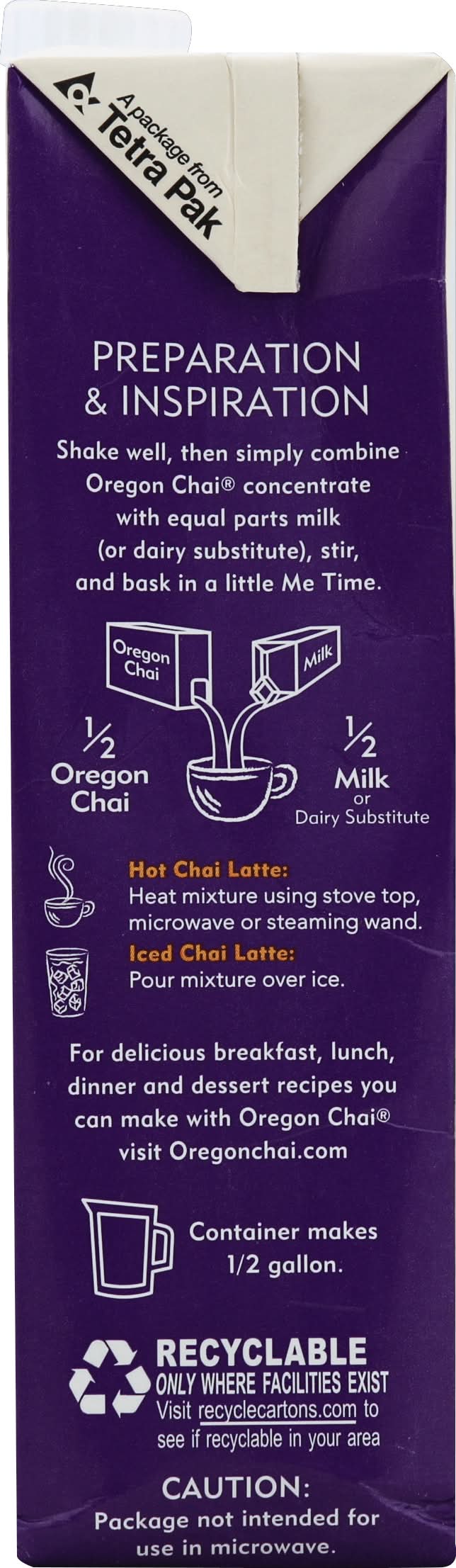 Shake well. refrigerate once open. use within four weeks. preparation & inspiration: shake well, then simply combine oregon chai concentrate with equal parts milk (or dairy substitute), stir, and bask in a little me time. 1/2 oregon chai. 1/2 milk or dairy substitute. hot chai latte: heat mixture using stove top, microwave or steaming wand. iced chai latte: pour mixture over ice.