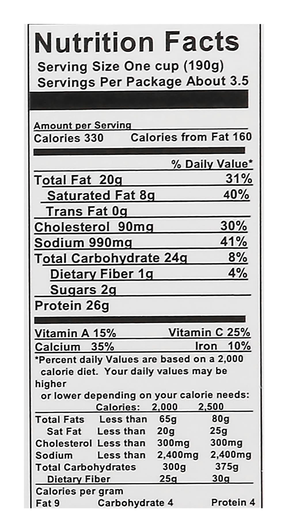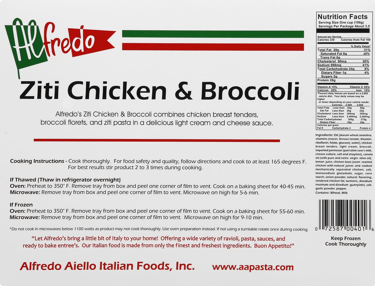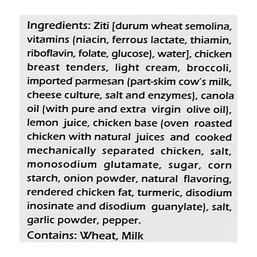 Ingredients: Ziti [Durum Wheat Semolina, Vitamins (Niaicn, Ferrous Lactate, Thiamin, Riboflavin, Folate, Glucose), Water], Chicken Breast Tenders, Light Cream, Broccoli, Imported Parmesan (Part-Skim Cow's Milk, Cheese Culture, Salt and Enzymes), Canola Oil (with Pure and Extra Virgin Olive Oil), Lemon Juice, Chicken Base (Oven Roasted Chicken with Natural Juices and Cooked Mechanically Separated Chicken, Salt, Monosodium Glutamate, Sugar, Corn Starch, Onion Powder, Natural Flavoring, Rendered Chicken Fat, Turmeric, Disodium Inosinate and Disodium Guanylate), Salt, Garlic Powder, Pepper Contains: Wheat, Milk