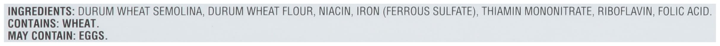 Ingredients: Durum Wheat Semolina, Durum Wheat Flour, Niacin, Iron (Ferrous Sulfate), Thiamin Mononitrate, Riboflavin, Folic Acid. Contains: Wheat, Eggs