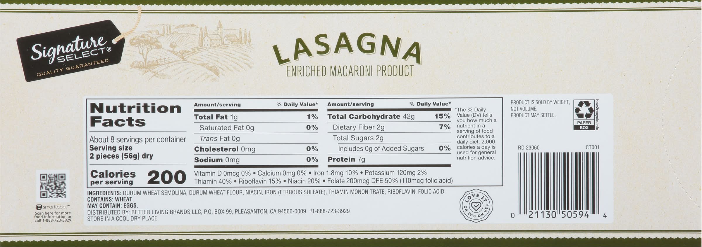 Enriched macaroni product. Non-GMO Project verified. nongmoproject.org. This product is sold by weight, not volume. Product may settle. Quality guaranteed. Love it or its on us (888-723-3929). Our Signature is Our Promise. Signature Select is your assurance of great quality products at the best value every day. We create our pastas and noodles with only the finest ingredients. We wouldn't put our signature on anything else. Quality and satisfaction guaranteed, or your money back. how2recycle.info. SmartLabel: Scan for more food information or call 1-888-723-3929.
