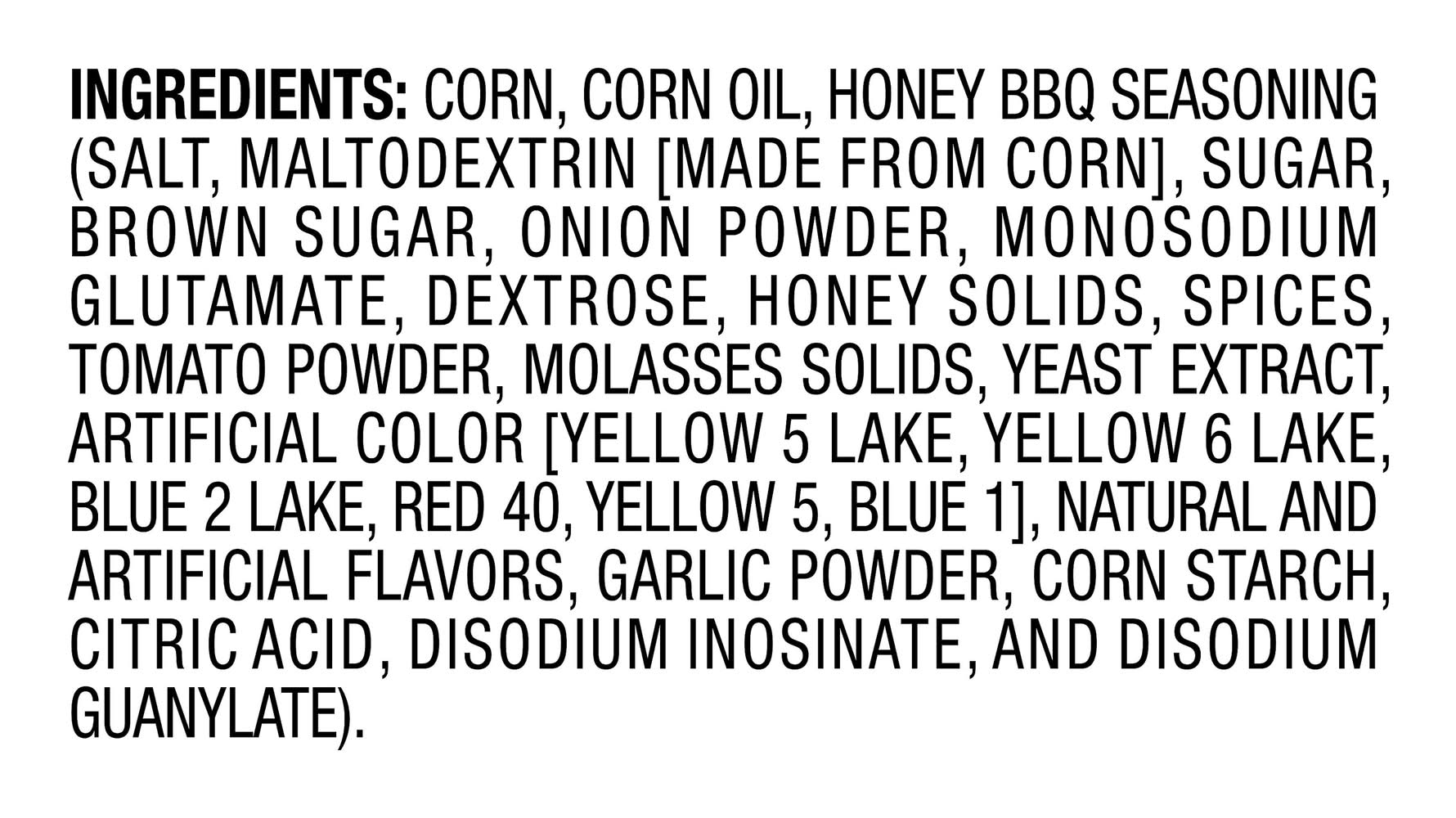 Ingredients: Corn, Corn Oil, Honey BBQ Seasoning (Salt, Maltodextrin [Made from Corn], Sugar, Brown Sugar, Onion Powder, Monosodium Glutamate, Dextrose, Honey Solids, Spices, Tomato Powder, Molasses Solids, Yeast Extract, Artificial Color [Yellow 5 Lake, Yellow 6 Lake, Blue 2 Lake, Red 40, Yellow 5, Blue 1], Natural and Artificial Flavors, Garlic Powder, Corn Starch, Citric Acid, Disodium Inosinate, and Disodium Guanylate)