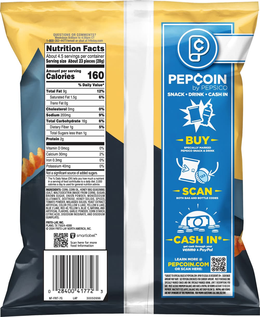 Pepcoin by PepsiCo Snack, Drink, Cash In. Venmo & PayPal. Buy specially marked PepsiCo snack and drink. Scan both bag and bottle codes. Cash In (Subject to official rules at pepcoin.com. open to legal us residents 18+. cash back amount may vary. see pepoin.com/rates for current amount. must purchase one specially marked snack and one specially marked drink. limit 3 redemptions per day. must accrue minimum balance and have a PayPal or Venmo account to receive payment. inactivity fees apply, balance will not drop below $0.paypal and Venmo are not sponsors of this promotion. • Brand: Fritos • Flavor: Honey bbq • Frito-Lay Inc, Plano, TX, 75024-4099