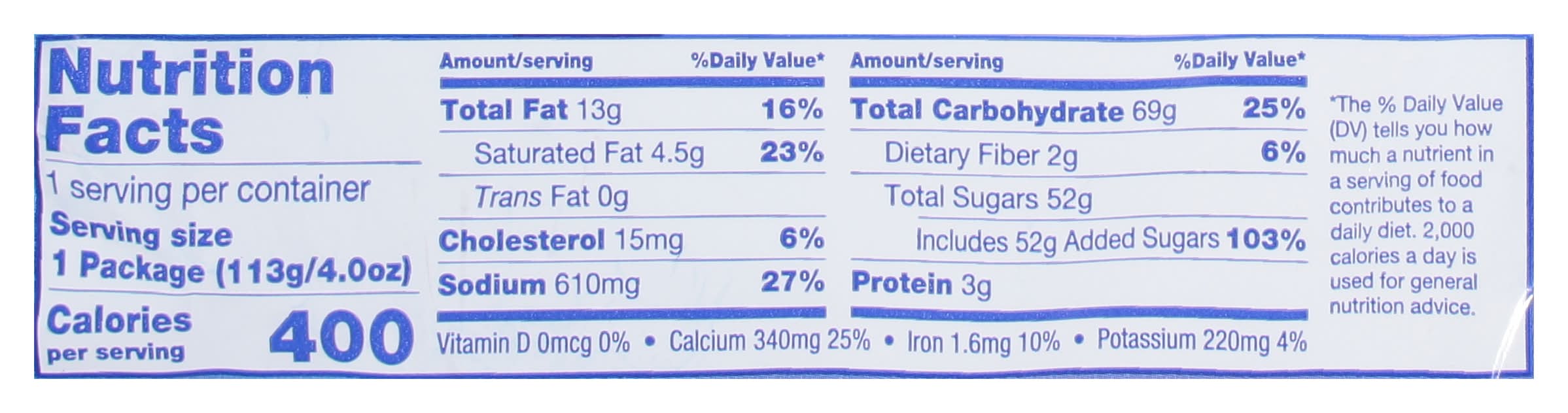 Ingredients: Sugar, Water, Unbleached Enriched Flour (Wheat Flour, Malted Barley Flour, Niacin, Reduced Iron, Thiamin Mononitrate, Riboflavin, Folic Acid), Corn Syrup, High Fructose Corn Syrup (with Sulfur Dioxide), Vegetable Oil (Palm Oil and Soybean Oil), Cocoa (Natural and Processed with Alkali), Contains 2% or Less of Each of the Following: Eggs, Dextrose, Corn Starch, Monoglycerides, Leavening (Sodium Acid Pyrophosphate, Baking Soda, Monocalcium Phosphate), Modified Corn Starch, Corn Flour, Calcium Carbonate, Salt, Chocolate Liquor, Calcium Sulfate, Glycerine, Wheat Flour, Mono- and Diglycerides, Sodium Stearoyl Lactylate, DATEM, Soy Lecithin, Xanthan Gum, Agar, Guar Gum, Potato Starch, Agave Syrup, Inulin (Agave), Citric Acid, Tricalcium Phosphate, Titanium Dioxide (Color), Polysorbate 60, Natural and Artificial Flavors, Sodium Hexametaphosphate, Cellulose Gum, Sorbitan Monostearate, Enzymes, Caramel Color, Potassium Sorbate and Sorbic Acid (to Retard Spoilage) Contains: Wheat, Barley, Corn, Soybeans, Eggs, Tree Nuts, Peanuts
