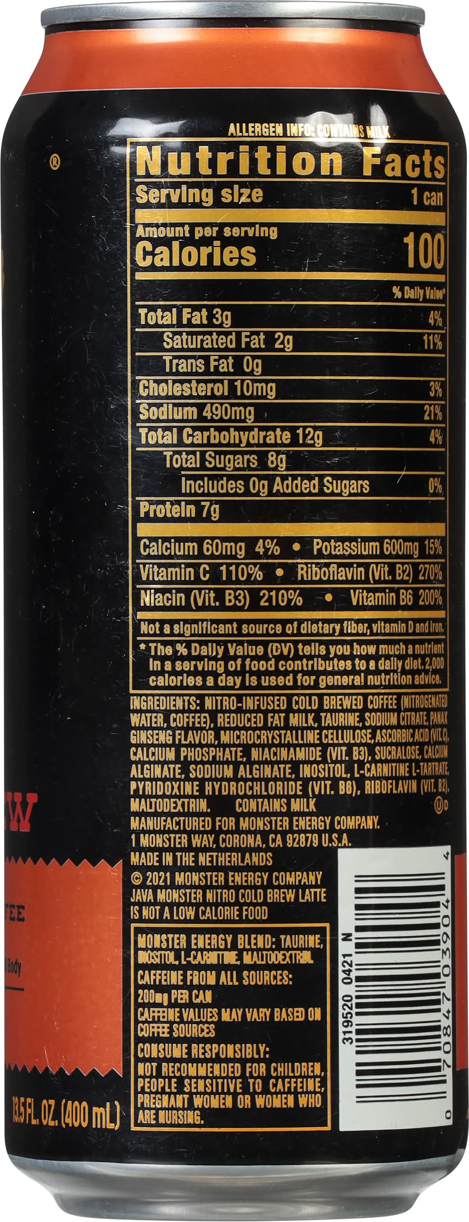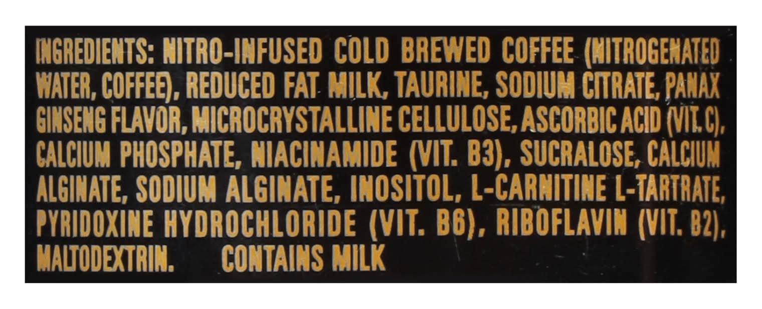 Ingredients: Nitro-Infused Cold Brewed Coffee (Nitrogenated Water, Coffee), Reduced Fat Milk, Taurine, Sodium Citrate, Panax Ginseng Flavor, Microcrystalline Cellulose, Ascorbic Acid (Vit. C), Calcium Phosphate, Niacinamide (Vit. B3), Sucralose, Calcium Alginate, Sodium Alginate, Inositol, L-Carnitine L-Tartrate, Pyridoxine Hydrochloride (Vit. B6), Riboflavin (Vit. B2), Maltodextrin. Monster Energy Blend: Taurine, Inositol, L-Carnitine, Maltodextrin Contains: Milk