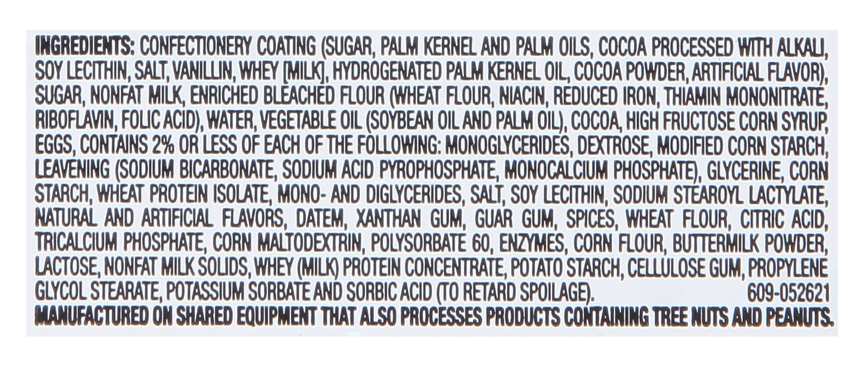 Ingredients: Confectionery Coating (Sugar, Palm Kernel and Palm Oils, Cocoa Processed with Alkali, Soy Lecithin, Salt, Vanillin, Whey [Milk), Hydrogenated Palm Kernel Oil, Cocoa Powder, Artificial Flavor), Sugar, Nonfat Milk, Enriched Bleached Flour (Wheat Flour, Niacin, Reduced Iron, Thiamin Mononitrate, Riboflavin, Folic Acid), Water, Vegetable Oil (Soybean Oil and Palm Oil), Cocoa, High Fructose Corn Syrup, Eggs, Contains 2% or Less of Each of the Following: Monoglycerides, Dextrose, Modified Corn Starch, Leavening (Sodium Bicarbonate, Sodium Acid Pyrophosphate, Monocalcium Phosphate), Glycerine, Corn Starch, Wheat Protein Isolate, Mono- and Diglycerides, Salt, Soy Lecithin, Sodium Stearoyl Lactylate, Natural and Artificial Flavors, DATEM, Xanthan Gum, Guar Gum, Spices, Wheat Flour, Citric Acid, Tricalcium Phosphate, Corn Maltodextrin, Polysorbate 60, Enzymes, Corn Flour, Buttermilk Powder, Lactose, Nonfat Milk Solids, Whey (Milk) Protein Concentrate, Potato Starch, Cellulose Gum, Propylene Glycol Stearate, Potassium Sorbate and Sorbic Acid (to Retard Spoilage) Contains: Soybeans, Milk, Wheat, Corn, Eggs, Lactose, Tree Nuts, Peanuts
