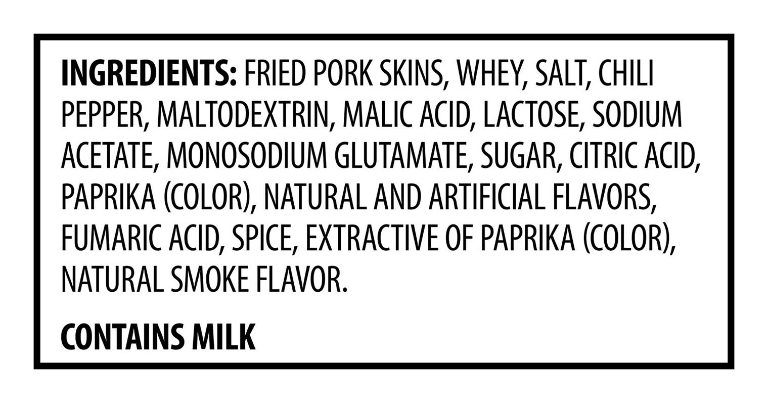 Ingredients: Fried Pork Skins, Lactose, Salt, Sodium Diacetate, Malic Acid, Citric Acid, Fumaric Acid, Soybean Oil, Natural Smoke Flavor Contains: Milk, Lactose, Soybeans