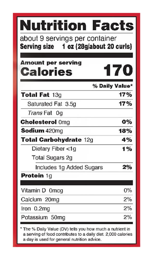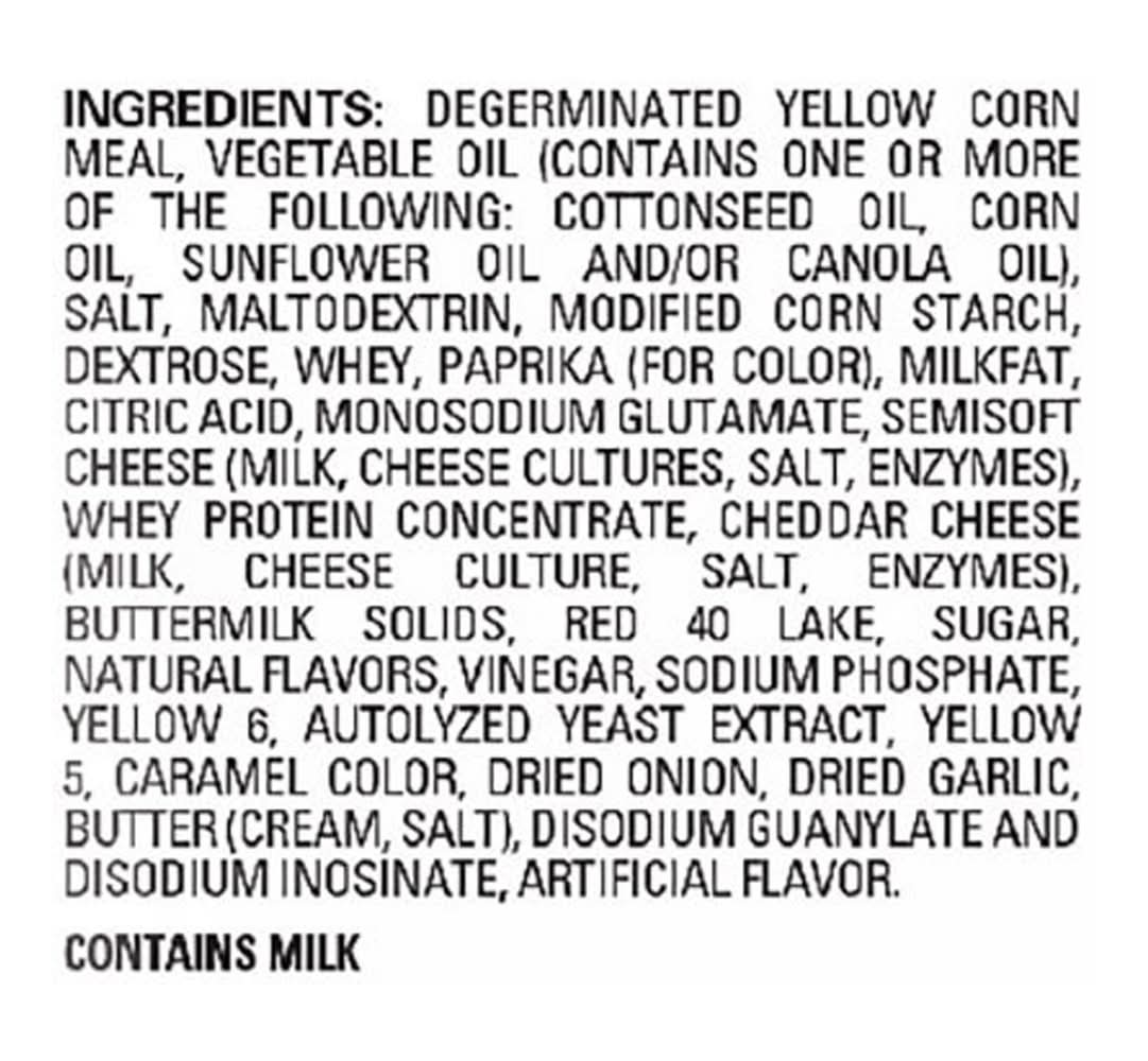 Ingredients: Degerminated Yellow Corn Meal, Vegetable Oil (Contains One or More of the Following: Cottonseed Oil Corn Oil Sunflower Oil and/or Canola Oil), Salt, Maltodextrin, Modified Corn Starch, Dextrose, Whey, Paprika (for Color), Milkfat, Citric Acid, Monosodium Glutamate, Semisoft Cheese (Milk Cheese Cultures Salt Enzymes), Whey Protein Concentrate, Cheddar Cheese (Milk Cheese Culture Salt Enzymes), Buttermilk Solids, Red 40 Lake, Sugar, Natural Flavors, Vinegar, Sodium Phosphate, Yellow 6, Autolyzed Yeast Extract, Yellow 5, Caramel Color, Dried Onion, Dried Garlic, Butter (Cream Salt), Disodium Guanylate and Disodium Inosinate, Artificial Flavor Contains: Corn, Milk