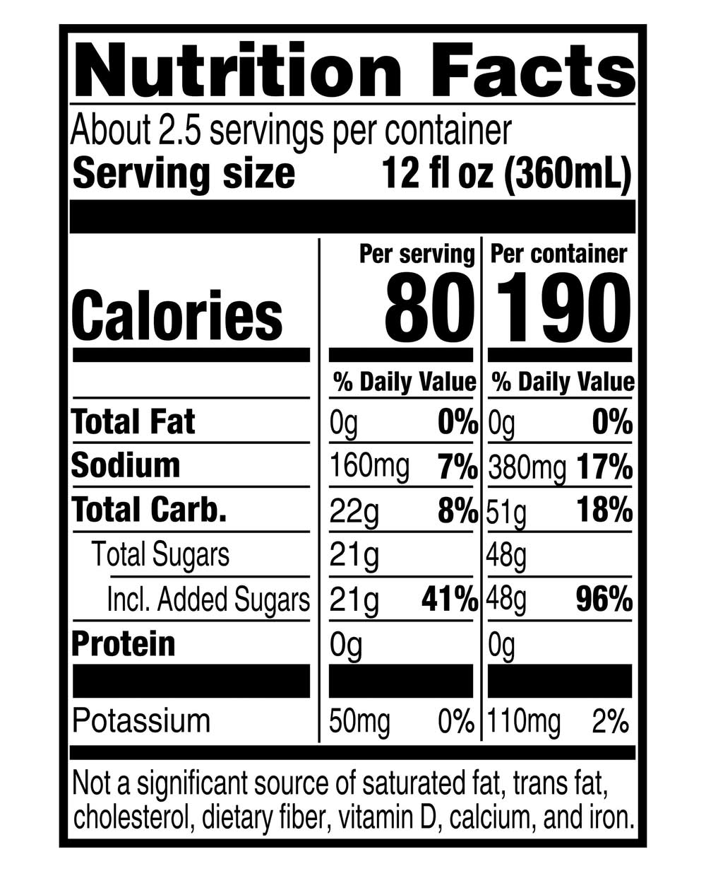 Ingredients: Water, Sugar, Dextrose, Citric Acid, Salt, Sodium Citrate, Monopotassium Phosphate, Modified Food Starch, Natural Flavor, Glycerol Ester of Rosin, Red 40, Caramel Color