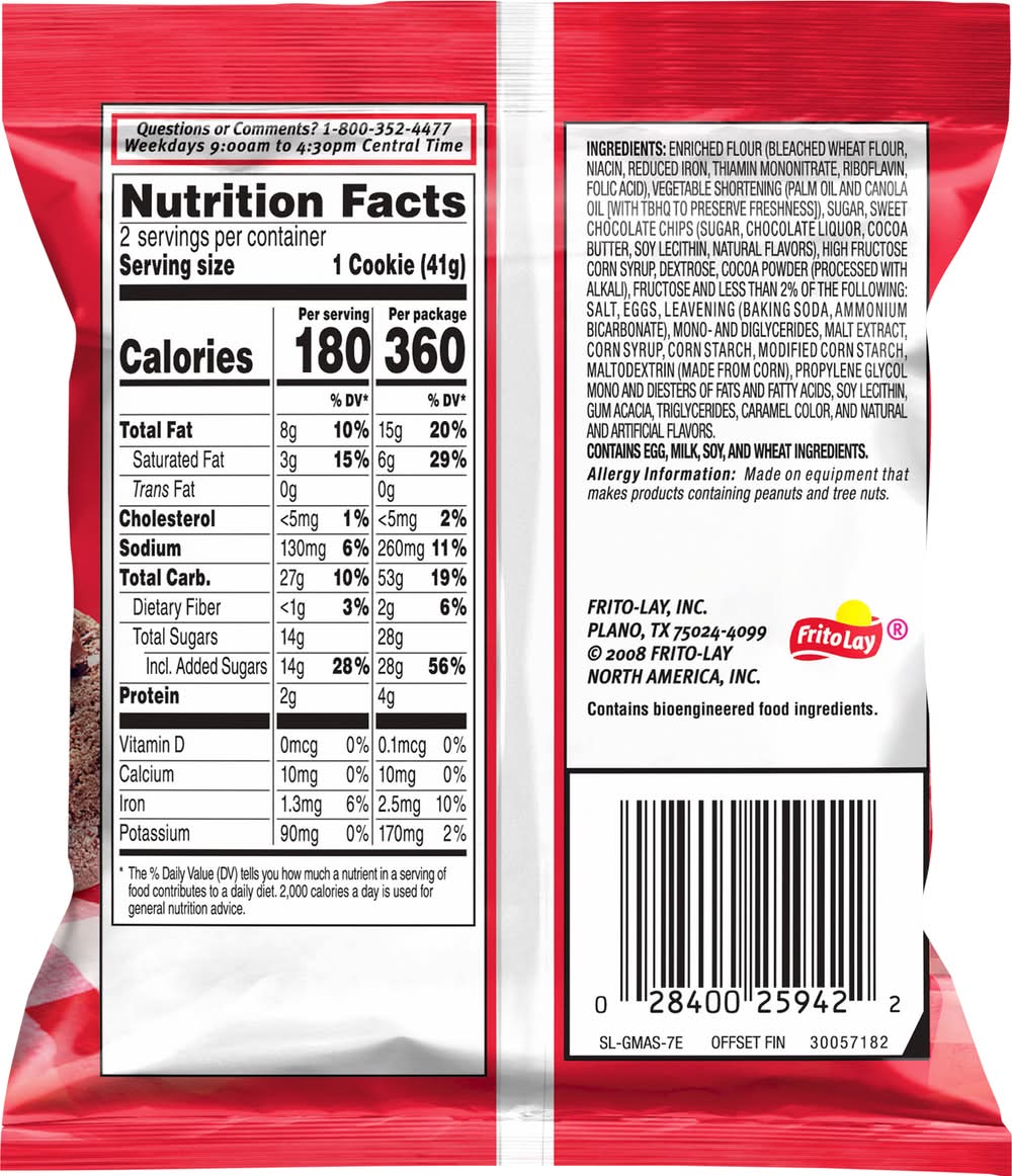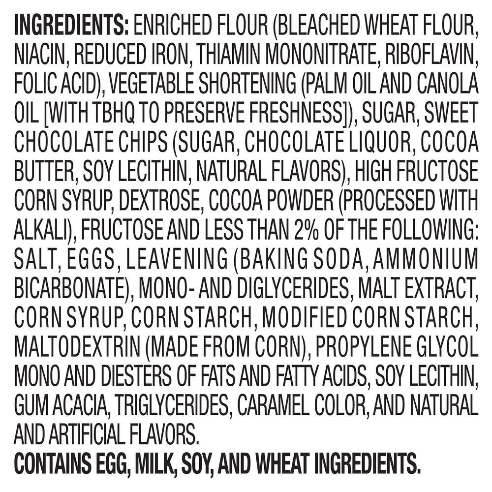 Ingredients: Enriched Flour (Bleached Wheat Flour Niacin Reduced Iron Thiamin Mononitrate Riboflavin Folic Acid), Vegetable Shortening (Palm Oil and Canola Oil [with TBHQ to Preserve Freshness]), Sugar, Sweet Chocolate Chips (Sugar Chocolate Liquor Cocoa Butter Soy Lecithin Natural Flavors), High Fructose Corn Syrup, Dextrose, Cocoa Powder (Processed with Alkali), Fructose and Less than 2% of the Following: Salt, Eggs, Leavening (Baking Soda Ammonium Bicarbonate), Mono- and Diglycerides, Malt Extract, Corn Syrup, Corn Starch, Modified Corn Starch, Maltodextrin (Made from Corn), Propylene Glycol Mono and Diesters of Fats and Fatty Acids, Soy Lecithin, Gum Acacia, Triglycerides, Caramel Color, and Natural and Artificial Flavors Contains: Wheat, Soybeans, Corn, Eggs, Milk, Peanuts, Tree Nuts
