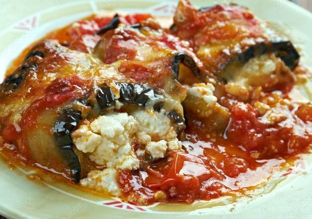 Eggplant rolled with ricotta, parmesan, parsley topped with tomato sauce, and melted Mozzarella. Served with salad and bread.