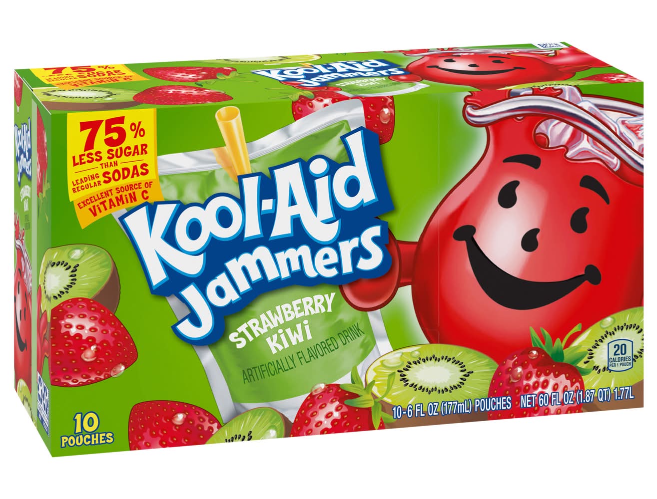 Artificially Flavored Strawberry Kiwi Pouches deliver fun with a sweet blend of strawberry and kiwi flavors. Our delicious kids drink contains 75% less sugar than leading regular sodas (per 12 fl oz, this product 10g total sugar, leading regular sodas 40g total sugar), making it a great fruit flavored for kids. Packed in a convenient pouch, kids can enjoy Kool-Aid at home, on the beach or during lunchtime. Each box of Strawberry Kiwi. • Flavor: Strawberry kiwi • Pack size: 10 • Kraft Heinz Foods Company, Chicago,IL,60601 • Packaging: Reusable