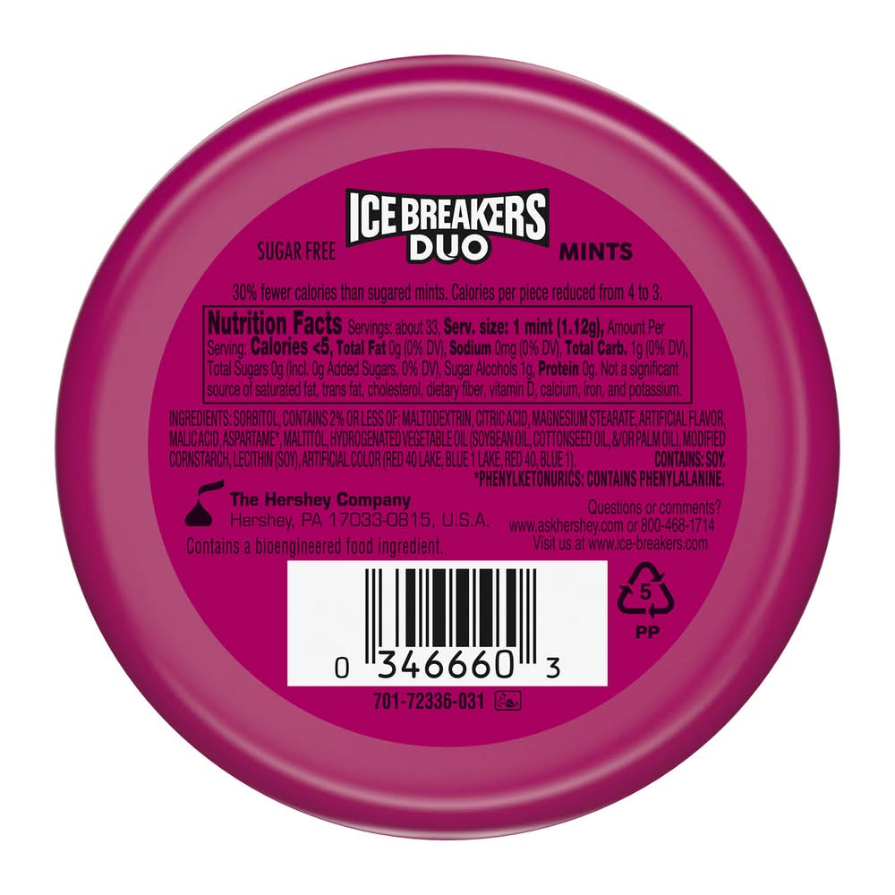 Goodbye bad breath, hello confident smile! Maintain fresh and fruity breath with ICE BREAKERS DUO raspberry flavored sugar free mints. These sugar free breath mints are full of crisp, fruity deliciousness that will have you smiling all day. Delight your taste buds with juicy raspberry and cooling mint flavor crystals. Plus, it's placed in a convenient tin, so you can keep your taste buds busy, no matter where the day takes you. Enjoy a crisp, smooth flavor with zero added sugar whenever you need a burst of fruity freshness. It's a tin that starts on the kitchen counter then comes with you to the car and ends up in the office cubicle. Don't stop there! Keep a container in your desk drawer at the office, the glove compartment in your car and the pantry at home for instant minty refreshment anytime you or your loved ones need it. Feeling generous? It's easy to share this treat amongst friends, family and co-workers. Getting ready for a first date? Pop a mint in before the first hello! Need to wake up during long road trips? Get a burst of energy after the first chew. Each compact container of ICE BREAKERS DUO mints will stay closed until you're ready, thanks to a handy snap-close lid, which can dispense just one mint if you're flying solo or several at a time if you're in the sharing mood. Make sure you have enough for Christmas stockings, Valentine's Day party favors, Easter baskets, trick or treat bags and work meetings that call for the freshest, fruitiest breath. • The Hershey Company, Hershey, PA, 17033-0815 • Packaging: Reusable