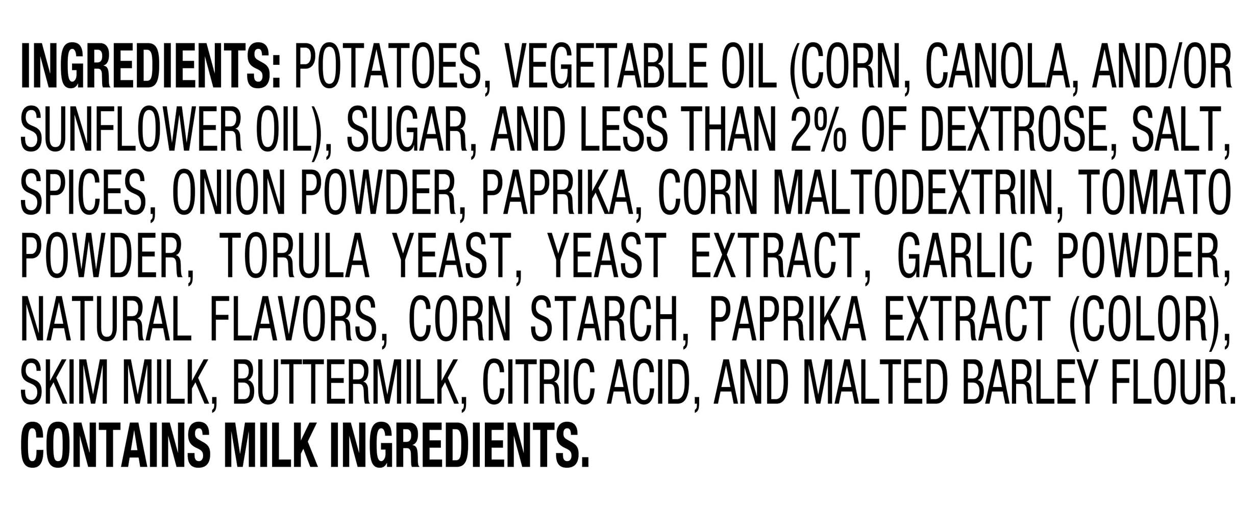 Ingredients: Potatoes, Vegetable Oil (Corn, Canola, And/Or Sunflower Oil), Sugar, And Less Than 2% Of Dextrose, Salt, Spices, Onion Powder, Paprika, Tomato Powder, Torula Yeast, Yeast Extract, Garlic Powder, Natural Flavors, Skim Milk, Buttermilk, Malted BARLEY Flour, And Carob Powder. CONTAINS MILK INGREDIENTS. Contains: Contains Milk Ingredients.