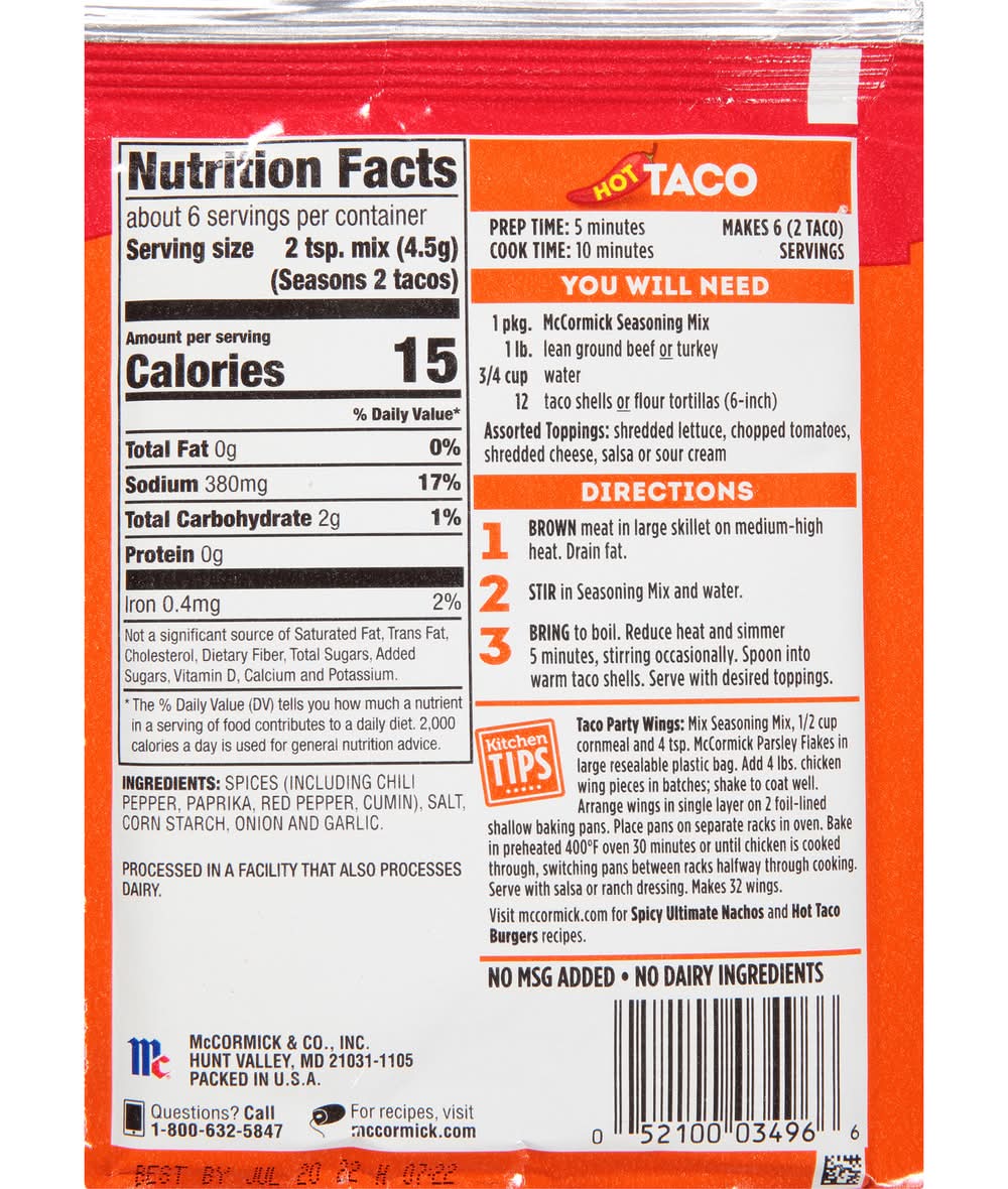 Treat your taste buds to a little fire! Made with chili peppers, cumin and cayenne, Hot Taco Seasoning Mix is a spicier, kicked-up version of our original Taco blend, ready to bring heat and flavor to beef, chicken or vegetarian tacos. McCormick & Co., Inc., Hunt Valley,MD