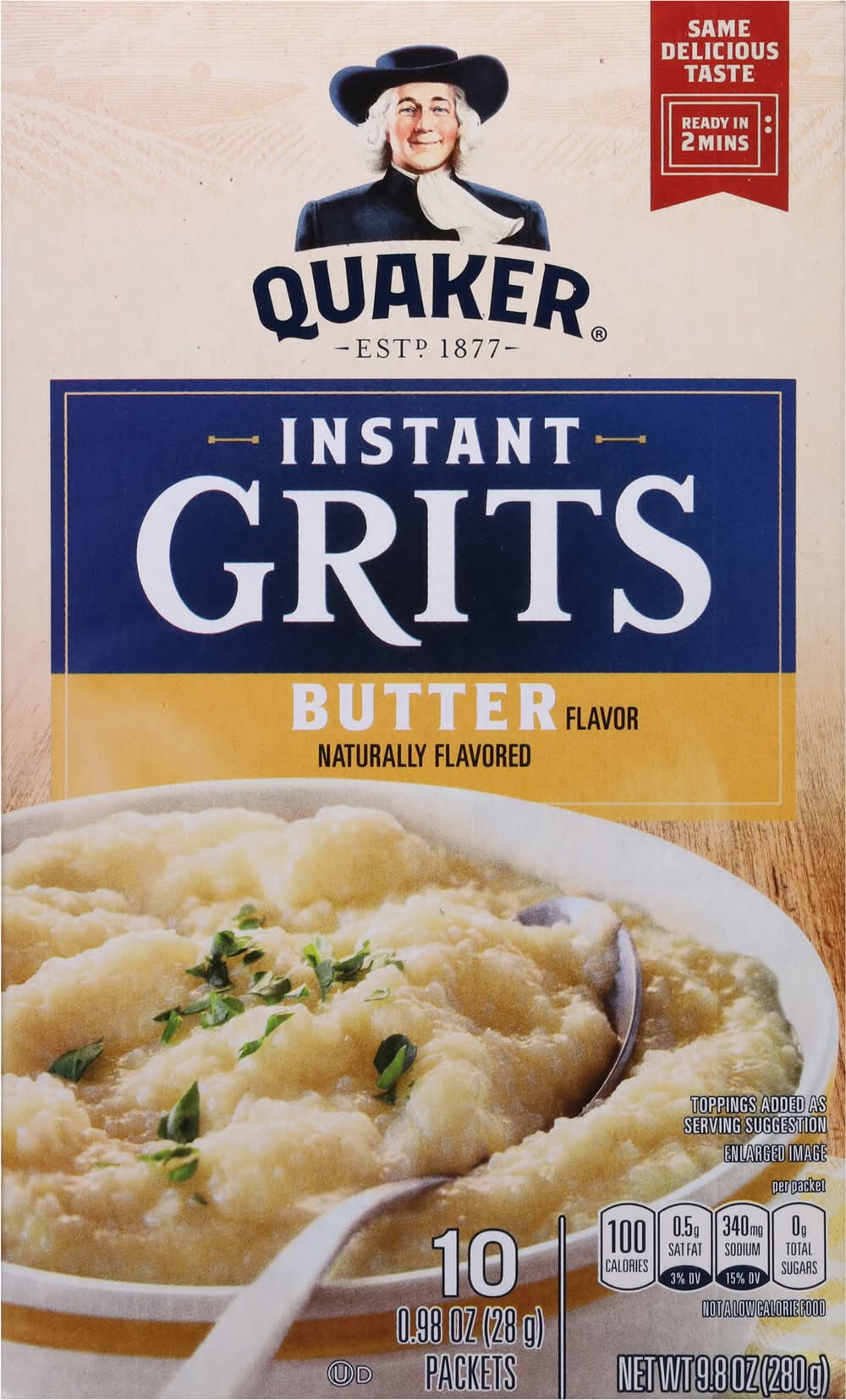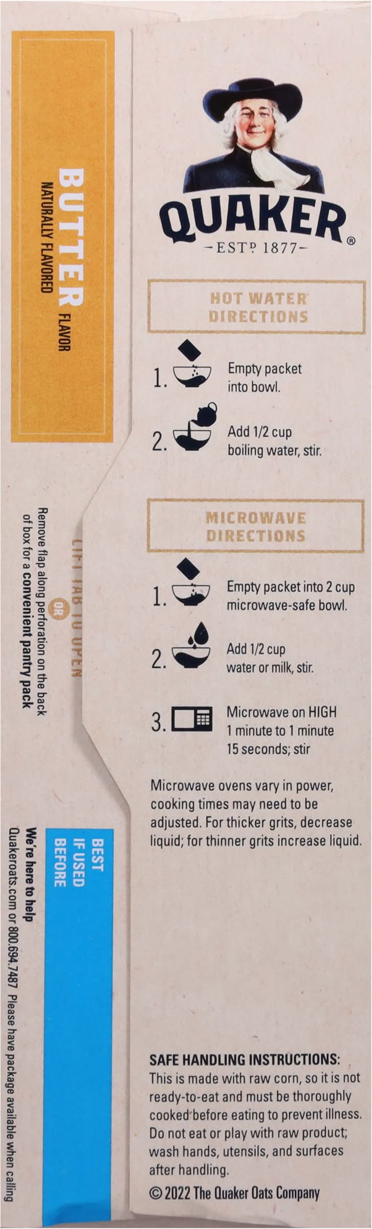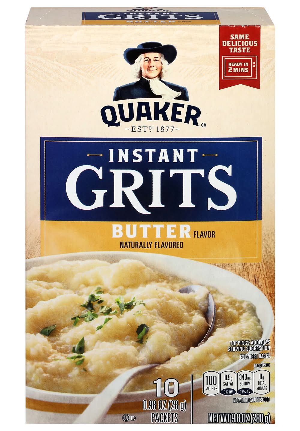 Naturally flavored. An excellent source of iron. See nutrition information for sodium content. Est 1877. Same delicious taste. Ready in 2 mins. Not a low calorie food. Delicious anytime. Our grits make a great addition to any meal! Enjoy one of our many delicious flavors, or mix things up and try adding your own grits topper your family will love - from savory butter, shredded cheese, green onions, or shrimp, to sweet cream, honey or sugar. Simply the best quality quaker has set the standard in grits for over 100 years. Only quaker instant grits can help your family continue the tradition with easy to prepare, smooth and creamy grits. Please Note: Tiny dark specks occasionally found in our grits are naturally occurring in the corn we use in this product and do not affect the taste or texture. Give them the flavors they love. Cheesy, original, butter or spicy - Quaker Instant Grits has the perfect taste for every occasion. Country Bacon; Cheese Lovers; Original; Cheddar Cheese; Red Eye Gravy & Country Ham. • Flavor: Butter • Pack size: 10 • Packaging: Reusable