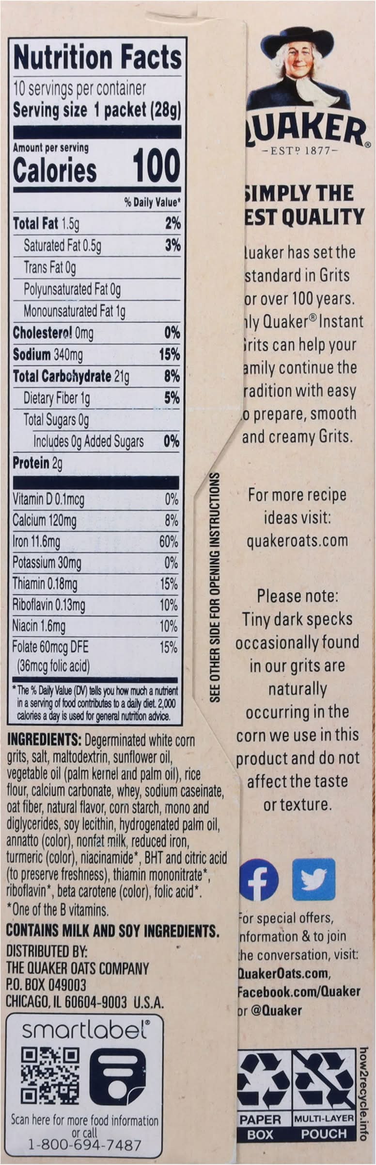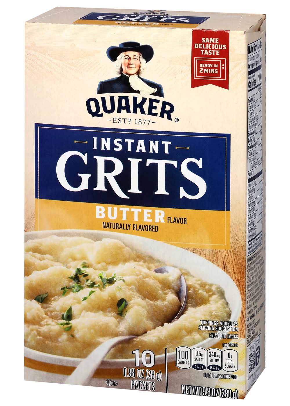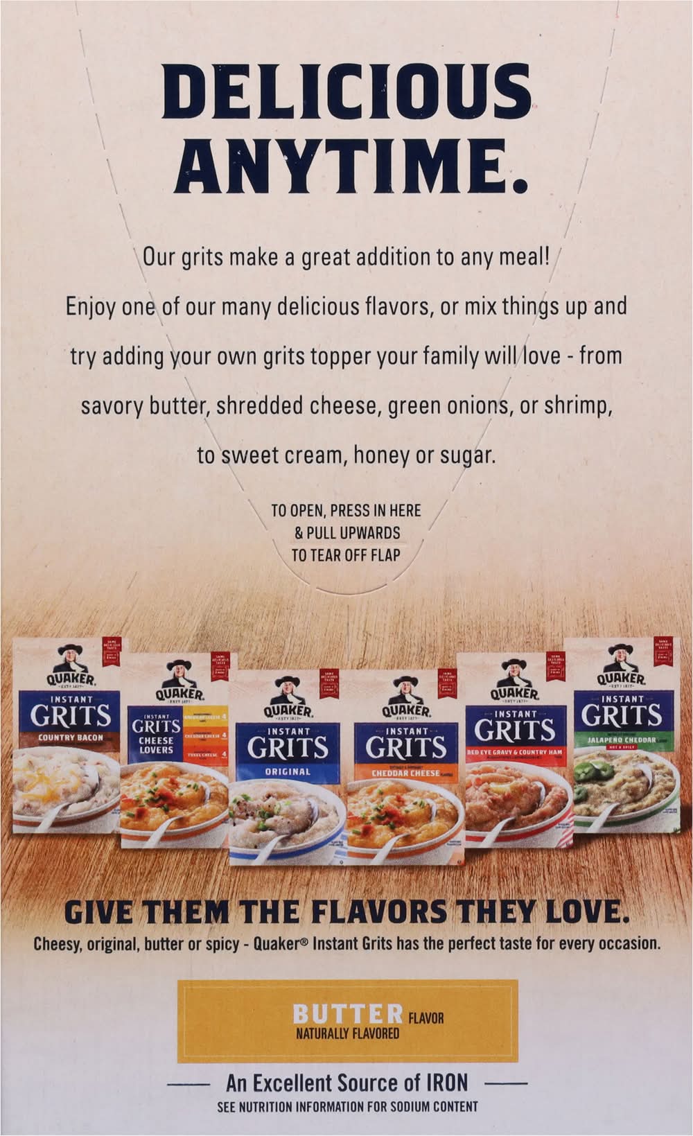 Naturally flavored. An excellent source of iron. See nutrition information for sodium content. Est 1877. Same delicious taste. Ready in 2 mins. Not a low calorie food. Delicious anytime. Our grits make a great addition to any meal! Enjoy one of our many delicious flavors, or mix things up and try adding your own grits topper your family will love - from savory butter, shredded cheese, green onions, or shrimp, to sweet cream, honey or sugar. Simply the best quality quaker has set the standard in grits for over 100 years. Only quaker instant grits can help your family continue the tradition with easy to prepare, smooth and creamy grits. Please Note: Tiny dark specks occasionally found in our grits are naturally occurring in the corn we use in this product and do not affect the taste or texture. Give them the flavors they love. Cheesy, original, butter or spicy - Quaker Instant Grits has the perfect taste for every occasion. Country Bacon; Cheese Lovers; Original; Cheddar Cheese; Red Eye Gravy & Country Ham. • Flavor: Butter • Pack size: 10 • Packaging: Reusable