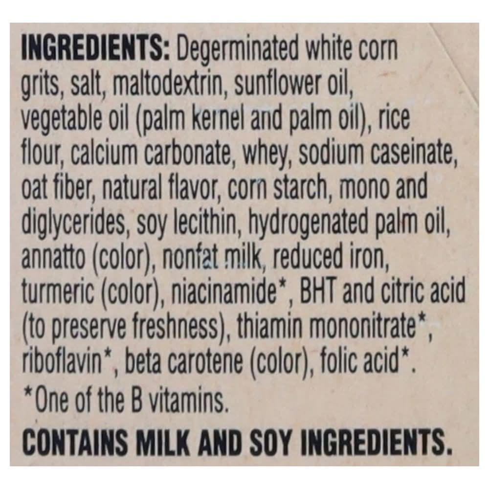 Ingredients: Degerminated White Corn Grits, Salt, Maltodextrin, Sunflower Oil, Vegetable Oil (Palm Kernel and Palm Oil), Rice Flour, Calcium Carbonate, Whey, Sodium Caseinate, Oat Fiber, Natural Flavor, Corn Starch, Mono and Diglycerides, Soy Lecithin, Hydrogenated Palm Oil, Annatto (Color), Nonfat Milk, Reduced Iron, Turmeric (Color), Niacinamide (One of the B Vitamins), BHT and Citric Acid (to Preserve Freshness), Thiamin Mononitrate (One of the B Vitamins), Riboflavin (One of the B Vitamins), Beta Carotene (Color), Folic Acid (One of the B Vitamins) Contains: Corn, Oat, Soybeans, Milk