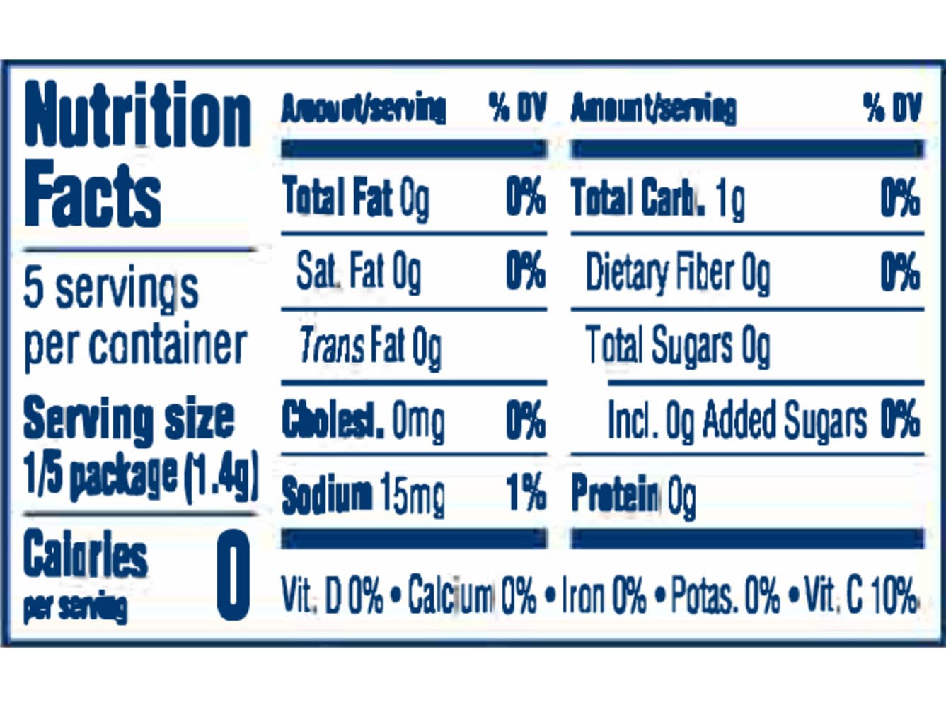 Ingredients: CITRIC ACID, MALTODEXTRIN, SALT, CONTAINS LESS THAN 2% OF ASCORBIC ACID (VITAMIN C), ARTIFICIAL FLAVOR, CALCIUM PHOSPHATE, ARTIFICIAL COLOR, YELLOW 5, BLUE 1.
