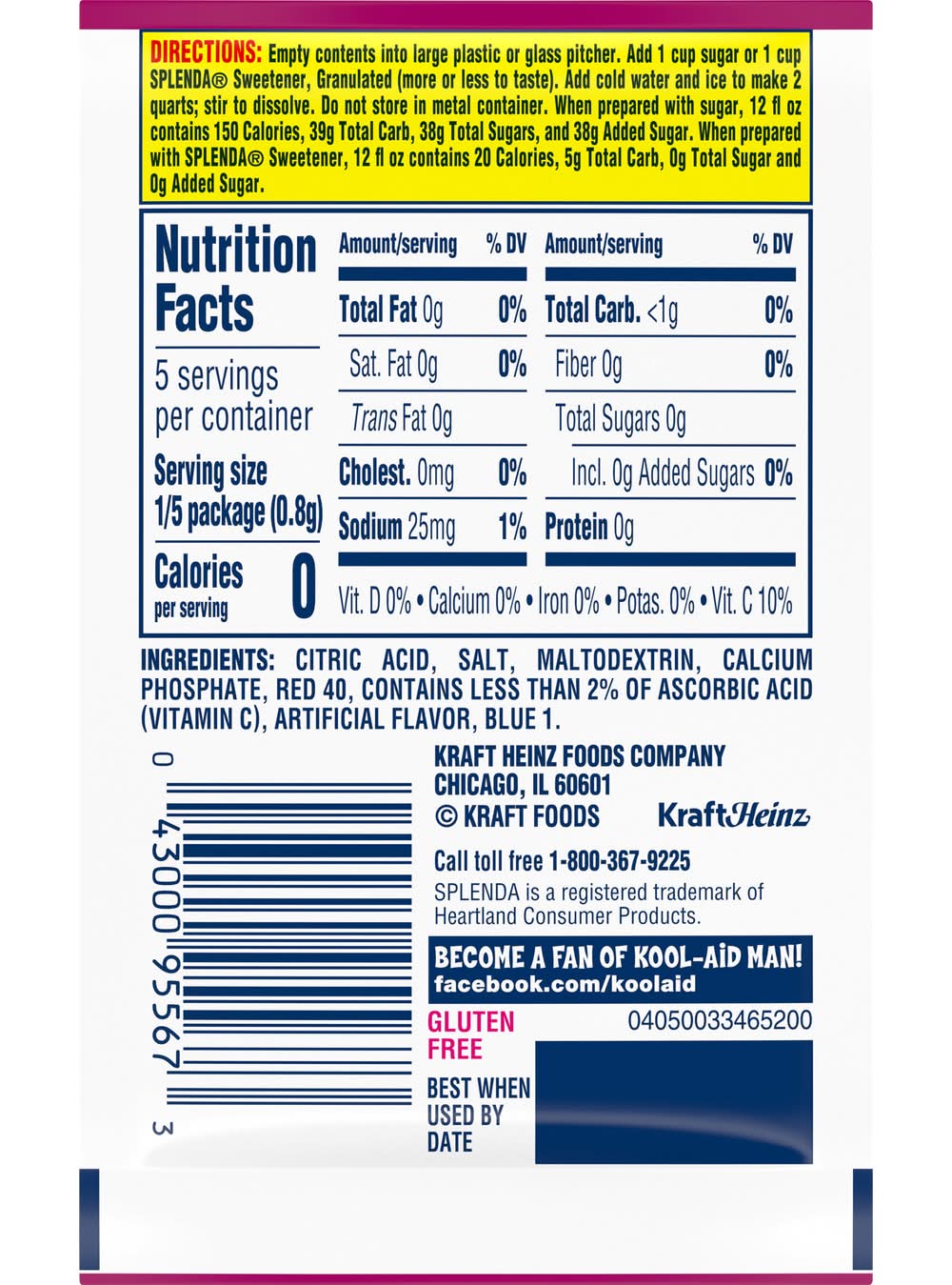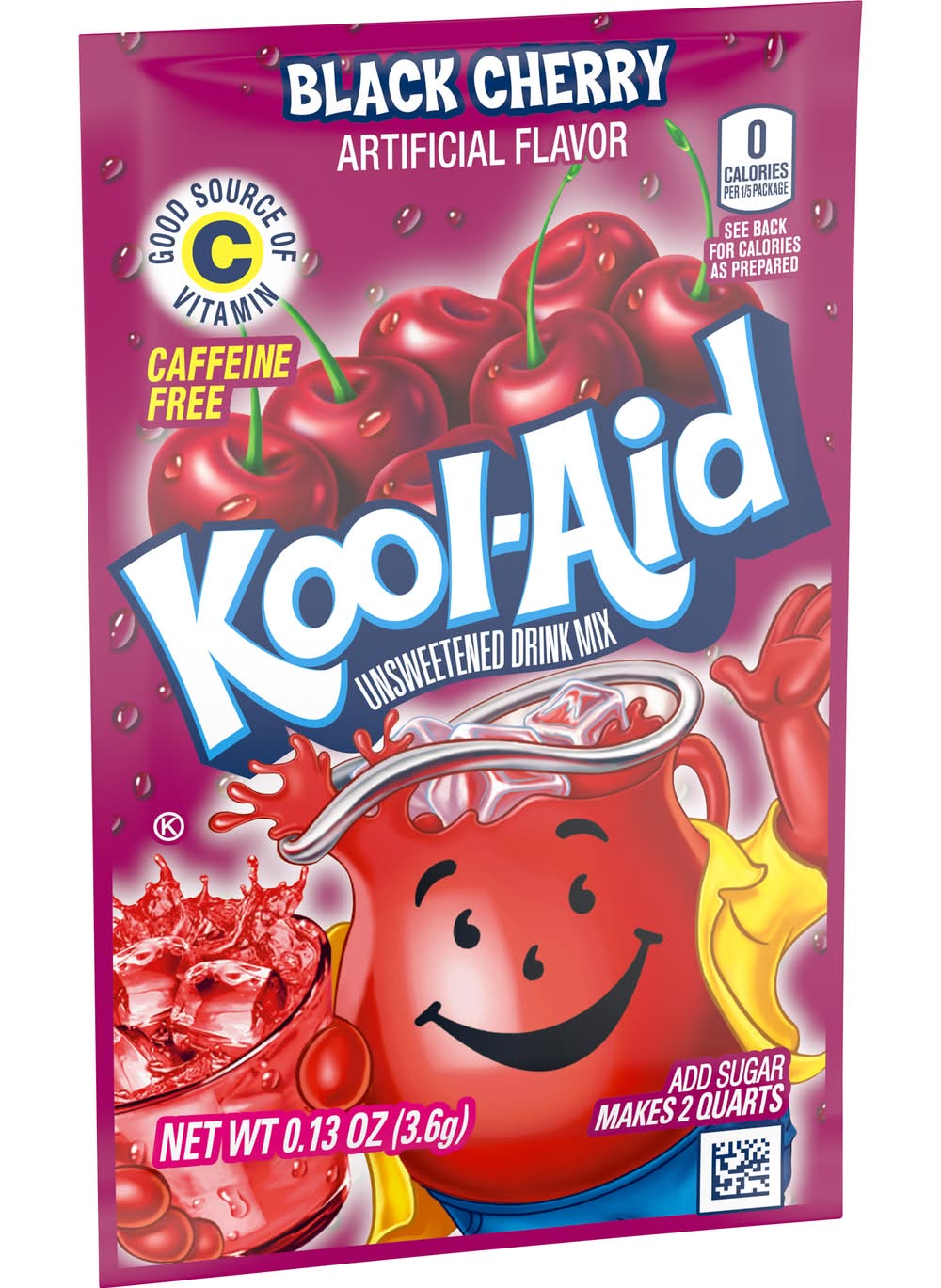 Kool-Aid Artificially Flavored Black Cherry Unsweetened Powdered Drink Mix is a delicious way to stay hydrated. This unsweetened powdered drink mix makes it easy to prepare a tasty black cherry drink. Just mix it with water and sugar or your sweetener of choice. Quench your thirst with the refreshingly sweet taste of black cherry. With no caffeine, this cherry artificially flavored powdered drink mix is always a great choice for the whole family. It's also a good source of vitamin C. These handy packets of unsweetened black cherry drink ensure that you always have a refreshing beverage ready-to-go. To prepare, empty contents of the 0.13 ounce drink mix packet into a plastic or glass pitcher. Add 1 cup of sugar or sweetener. Then, just add ice and water and stir for a 2 quart supply of tasty black cherry Kool-Aid. • Number of servings: 5 • Kraft Heinz Foods Company, Chicago, IL, 60601