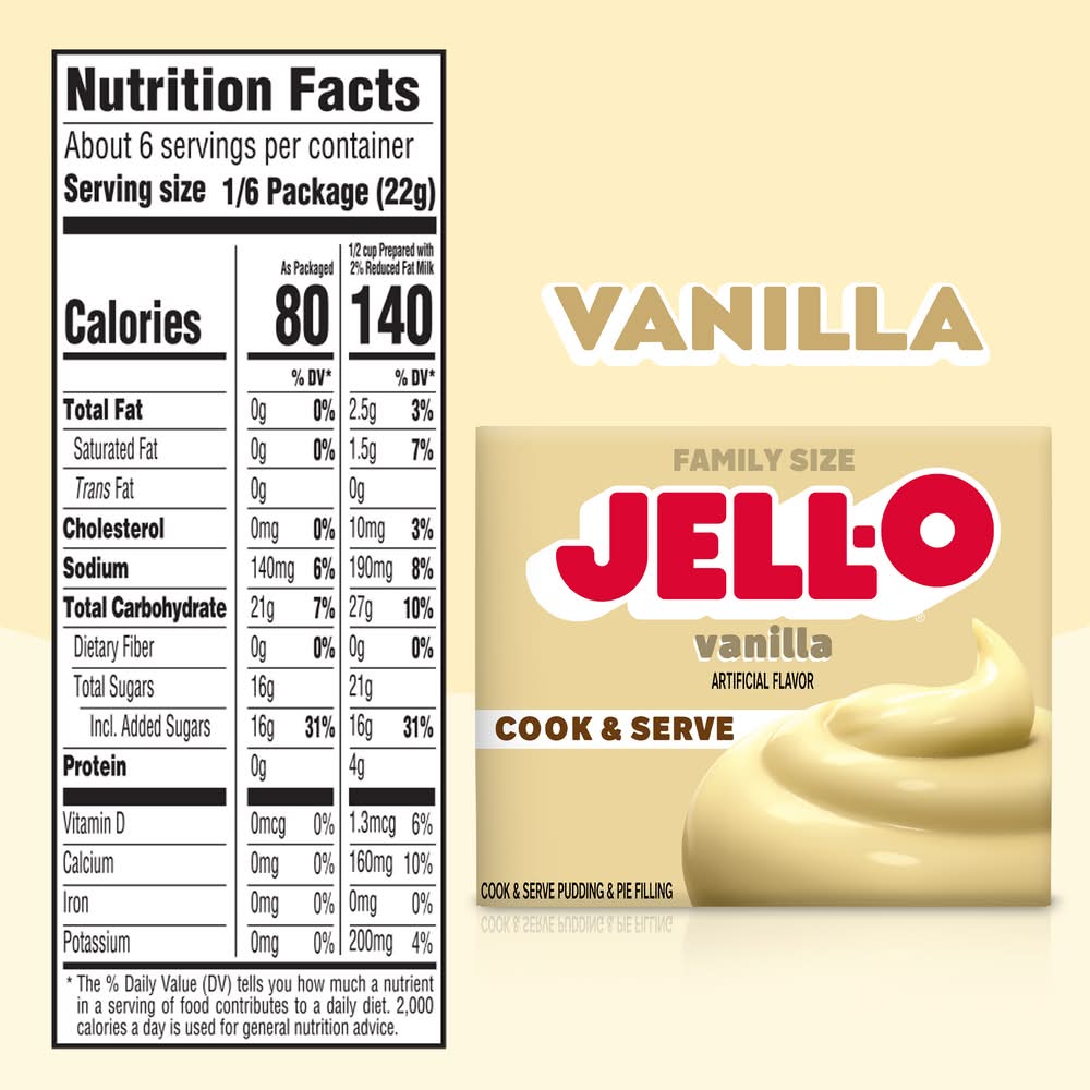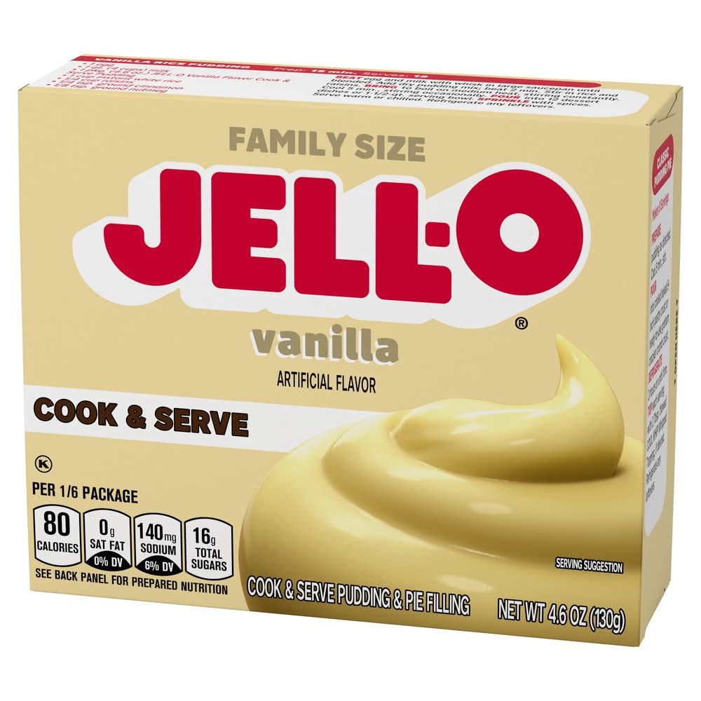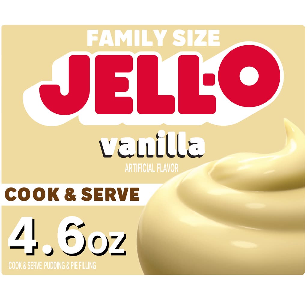 Snack happy. Jell-O Vanilla Artificially Flavored Cook & Serve Pudding & Pie Filling Mix tastes great whether you enjoy it as a treat or use it as an ingredient in your favorite dessert recipes. Add some wonder to your day with a delicious snack. Fun to make with your kids, our artificially flavored vanilla pudding mix can also be used to create a poke cake, tasty crepes or vanilla pie filling. To prepare, stir mix into 3 cups cold milk in medium saucepan, bring to a boil on medium heat while stirring constantly, then serve warm or chilled. Every Jell-O pudding mix comes packaged in a 4.6-ounce sealed pouch. Pudding fun in every bite. • Kraft Heinz Foods Company, Chicago, IL, 60601 • Packaging: Reusable