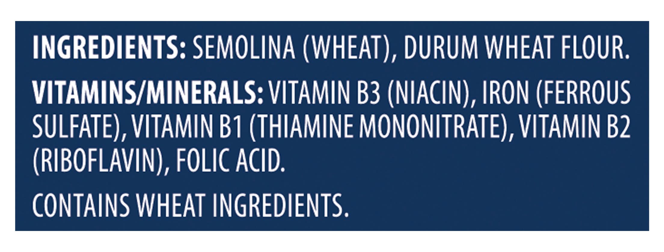 Ingredients: Semolina (Wheat), Durum Wheat Flour. Vitamins/Minerals: Vitamin B3 (Niacin), Iron (Ferrous Sulfate), Vitamin B1 (Thiamine Mononitrate), Vitamin B2 (Riboflavin), Folic Acid Contains: Wheat