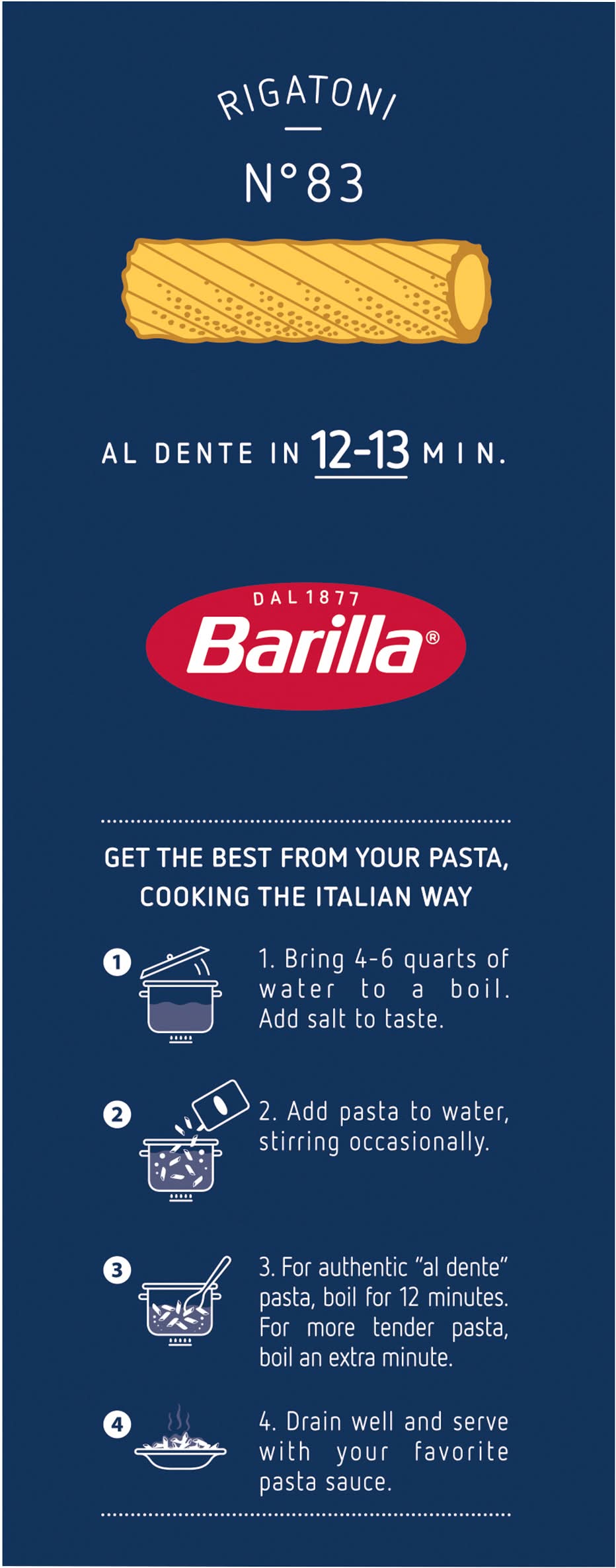 Get the best from your pasta, cooking the italian way: 1. bring 4-6 quarts of water to a boil. add salt to taste. 2. add pasta to water stirring occasionally. 3. for authentic al dente pasta, boil for 12 minutes. for more tender pasta, boil an extra minute. 4. drain well and serve with your favorite pasta sauce. to open, lift tab. contains wheat ingredients.