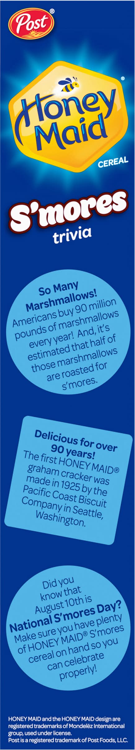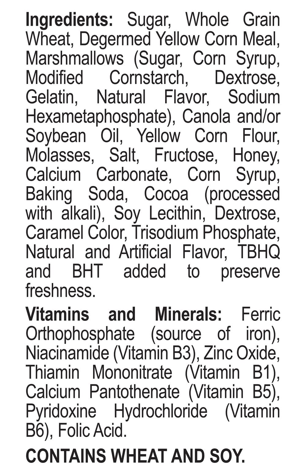 Ingredients: Sugar, Corn Meal, Whole Grain Wheat, Marshmallows (Sugar, Modified Cornstarch, Corn Syrup, Dextrose, Gelatin, Natural and Artificial Flavor, Sodium Hexametaphosphate), Canola Oil, Corn Flour, Molasses, Salt, Fructose, Honey, Calcium Carbonate, Baking Soda, Cocoa (Processed with Alkali), Soy Lecithi Contains: wheat, soybeans
