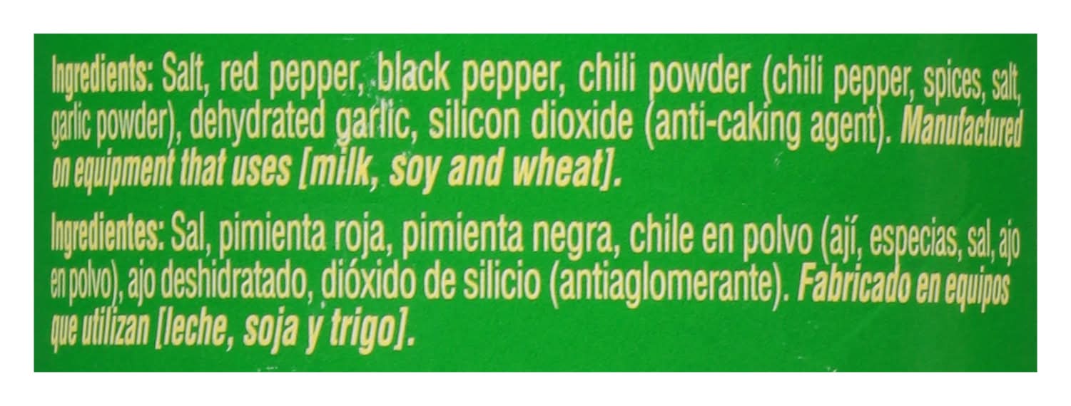Ingredients: Salt, Red Pepper, Black Pepper, Chili Powder (Chili Pepper, Spices, Salt, Garlic Powder), Dehydrated Garlic, Silicon Dioxide (Anti-Caking Agent) Contains: Milk, Soybeans, Wheat