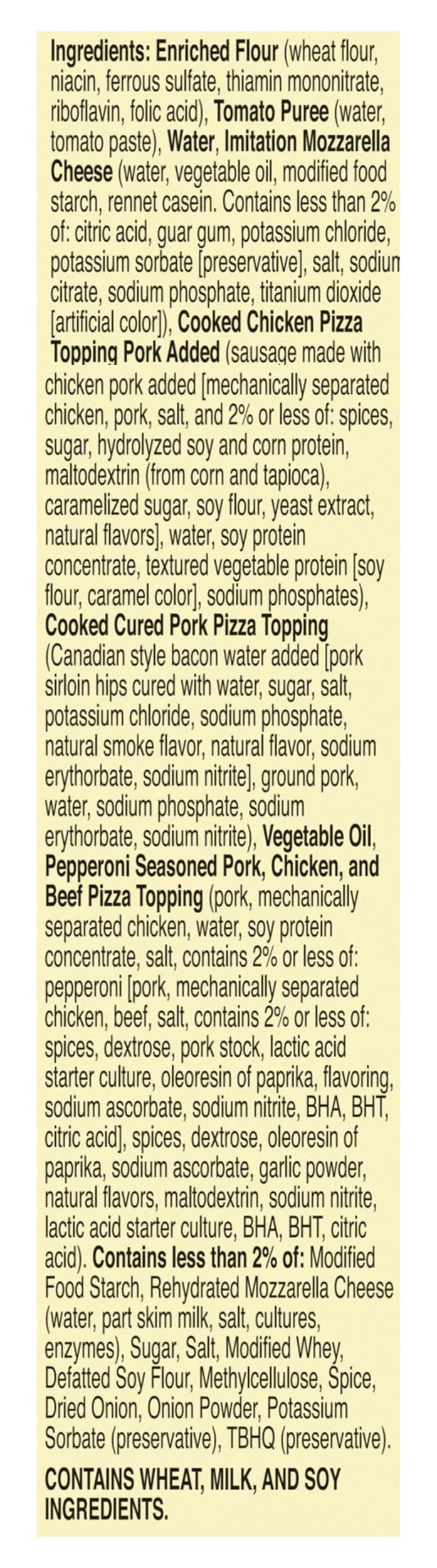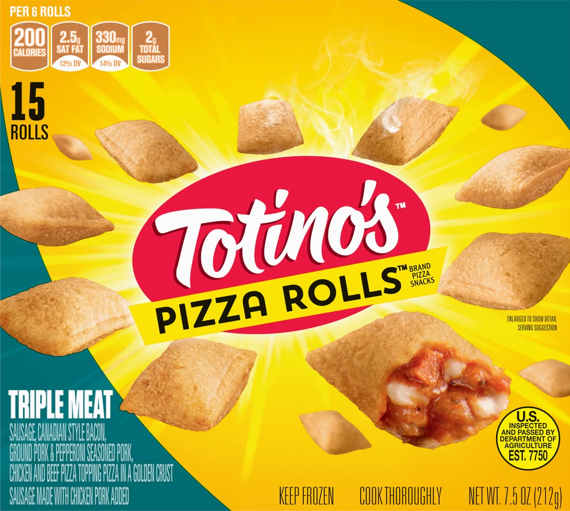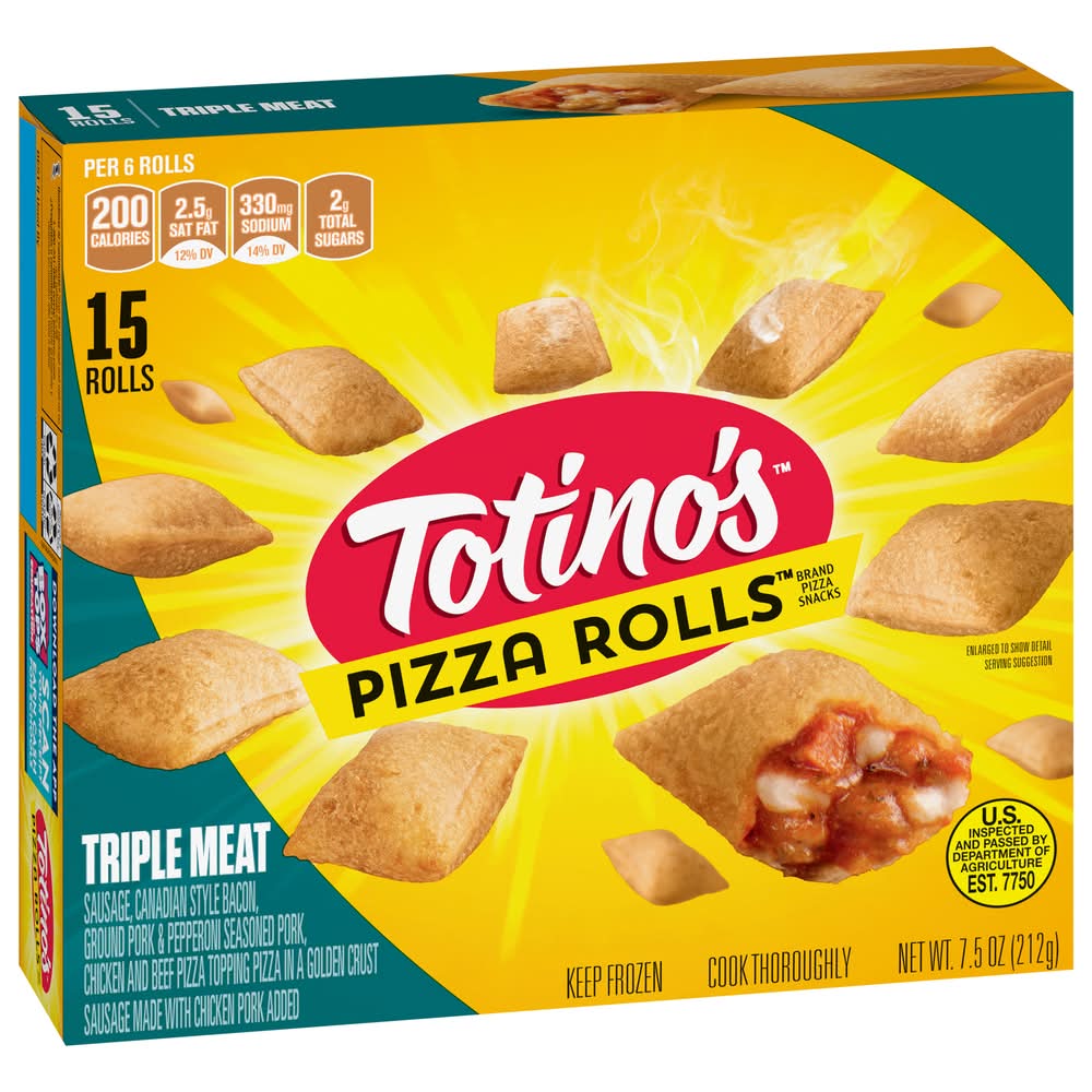 Totino's Triple Meat Pizza Rolls bring together a blend of three meats in a bite-sized pizza snack. Easy to prepare, these pizza rolls can be enjoyed after just sixty seconds in the microwave or within ten minutes if using an air fryer. Ideal for various occasions, they offer a convenient option for those needing a quick snack. • Number of servings: 2 • General Mills Sales, Inc., Minneapolis, MN, 55440 • Packaging: Reusable