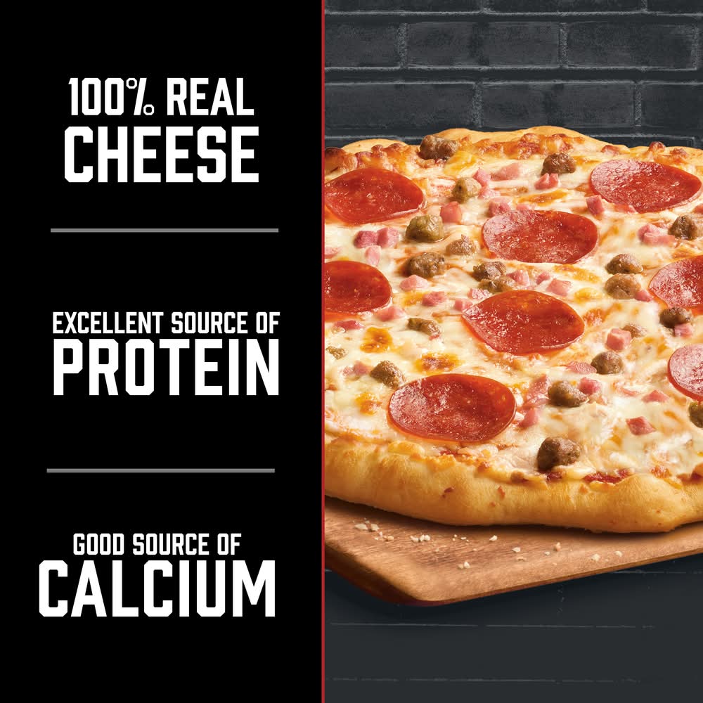 Brick Oven Pizza is made with zesty tomato sauce, 100% real cheese, and hearty toppings of ham, sausage and pepperoni Flavor: Meat-trio