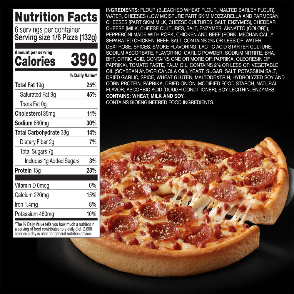 Ingredients: INGREDIENTS: FLOUR (BLEACHED WHEAT FLOUR, MALTED BARLEY FLOUR), WATER, CHEESE BLEND (LOW MOISTURE PART SKIM MOZZARELLA AND PARMESAN CHEESES [PART SKIM MILK, CHEESE CULTURES, SALT, ENZYMES], CHEDDAR CHEESE [MILK, CHEESE CULTURES, SALT, ENZYMES, ANNATTO (COLOR)]), PEPPERONI MADE WITH PORK, CHICKEN AND BEEF (PORK, MECHANICALLY SEPARATED CHICKEN, BEEF, SALT, CONTAINS 2% OR LESS OF: DEXTROSE, LACTIC ACID STARTER CULTURE, FLAVORING, SODIUM NITRITE, BHA, BHT, CITRIC ACID. MAY ALSO CONTAIN: SPICES, WATER, PAPRIKA, OLEORESIN OF PAPRIKA, SPICE EXTRACTIVES, SMOKE FLAVORING, SODIUM ASCORBATE, ASCORBIC ACID, BEEF STOCK), TOMATO PASTE, PALM OIL, CONTAINS 2% OR LESS OF: VEGETABLE OIL (SOYBEAN AND/OR CANOLA OIL), YEAST, SUGAR, SALT, POTASSIUM SALT, DRIED GARLIC, SPICE, WHEAT GLUTEN, MALTODEXTRIN, HYDROLYZED SOY AND CORN PROTEIN, PAPRIKA, DRIED ONION, MODIFIED FOOD STARCH, NATURAL FLAVOR, ASCORBIC ACID (DOUGH CONDITIONER), SOY LECITHIN, ENZYMES. Contains: Milk, Wheat, Soy