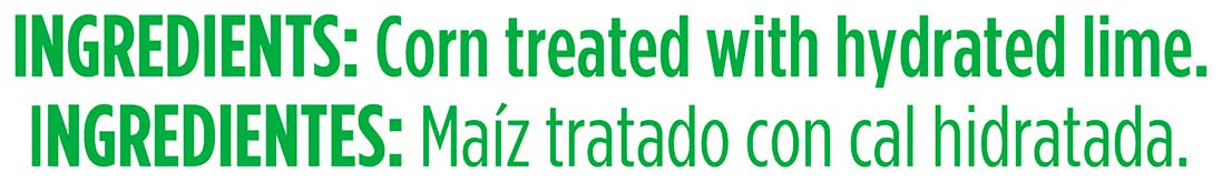 Ingredients: Corn treated with hydrated lime Contains: Corn