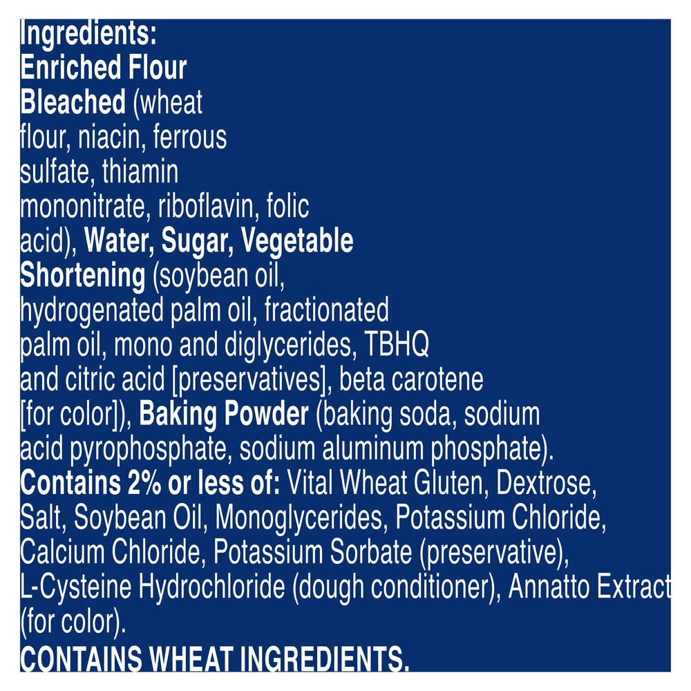 Ingredients: Enriched Flour Bleached (Wheat Flour, Niacin, Ferrous Sulfate, Thiamin Mononitrate, Riboflavin, Folic Acid), Water, Sugar, Vegetable Shortening (Soybean Oil, Hydrogenated Palm Oil, Fractionated Palm Oil, Mono and Diglycerides, TBHQ and Citric Acid [Preservatives], Beta Carotene [for Color]), Baking Powder (Baking Soda, Sodium Acid Pyrophosphate, Sodium Aluminum Phosphate), Contains 2% or Less of: Vital Wheat Gluten, Dextrose, Salt, Soybean Oil, Monoglycerides, Potassium Chloride, Calcium Chloride, Potassium Sorbate (Preservative), L-Cysteine Hydrochloride (Dough Conditioner), Annatto Extract (for Color) Contains: Wheat, Soybeans, Gluten