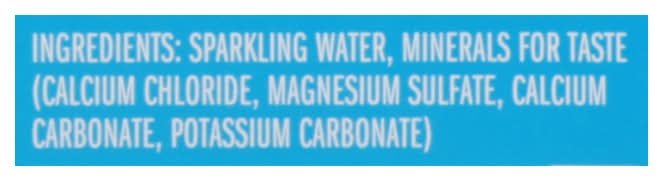 Ingredients: Sparkling Water, Minerals for Taste (Calcium Chloride, Magnesium Sulfate, Calcium Carbonate, Potassium Carbonate)