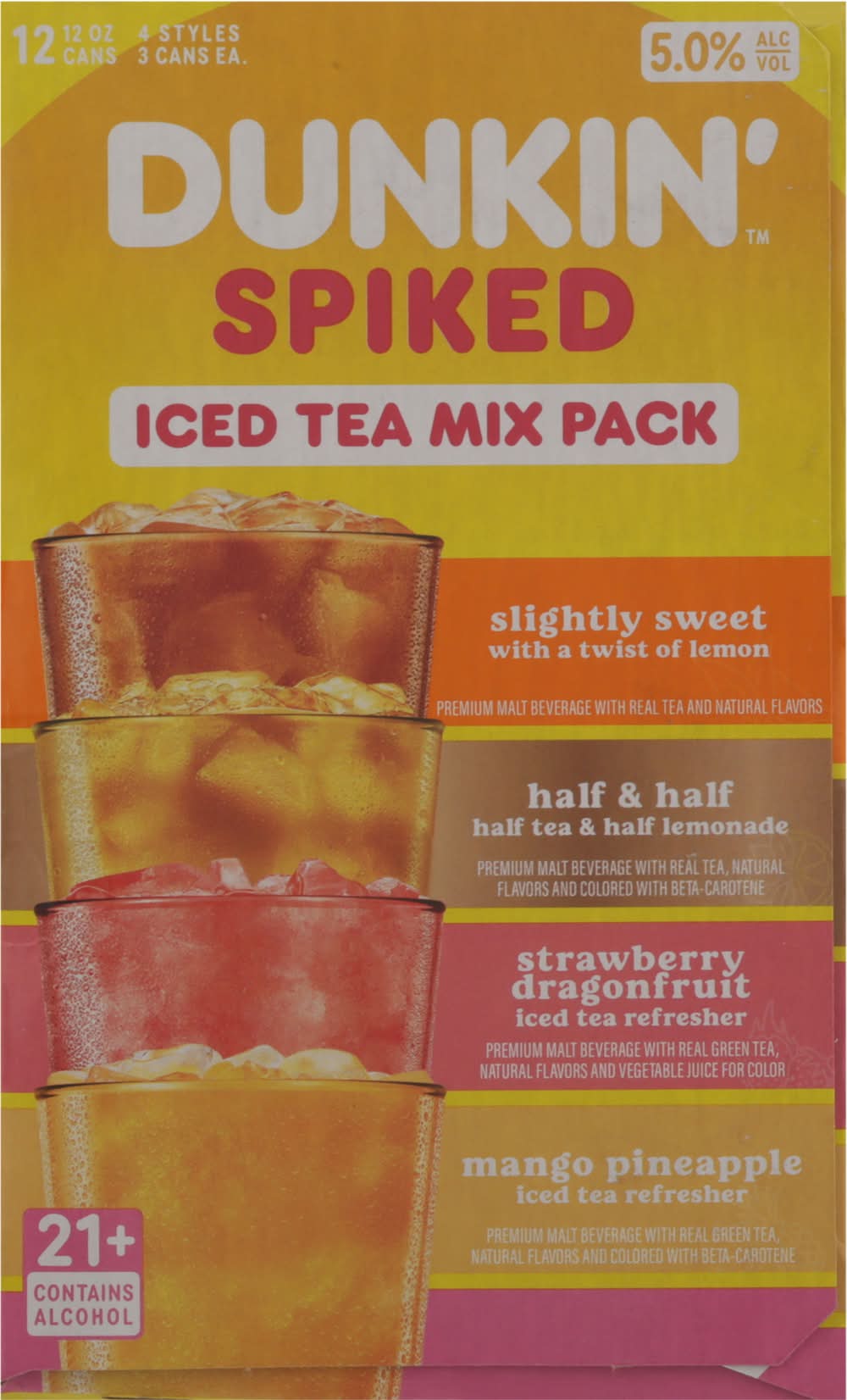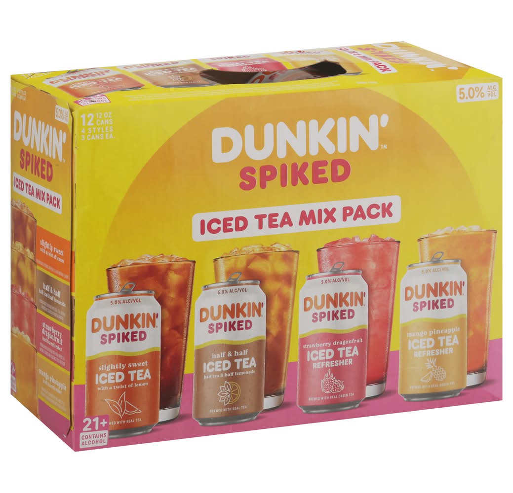 21+. Slightly Sweet: Premium malt beverage with real tea and natural flavors. Half & Half: Premium malt beverage with real tea, natural flavors and colored with beta-carotene. Strawberry Dragonfruit: Premium malt beverage with real green tea, natural flavors and vegetable juice for color. Mango Pineapple: Premium malt beverage with real green tea, natural flavors and colored with beta-carotene Dairy free. Dunkin' Spiked Slightly Sweet Iced Tea is a premium malt beverage with real tea and natural flavors, Dunkin' Spiked Half & Half Iced Tea and Dunkin' Spiked Mango Pineapple Iced Tea are premium malt beverages with real tea, natural flavors and colored with beta-carotene, Dunkin' Spiked Strawberry Dragonfruit Iced Tea is a premium malt beverages with real tea, natural flavors and vegetable juice for color. 5.0% Alc/vol. 10 Brewed & Packed by American Spiked Beverages-Boston, MA. • Pack size: 12 • Alcohol by volume: 5%