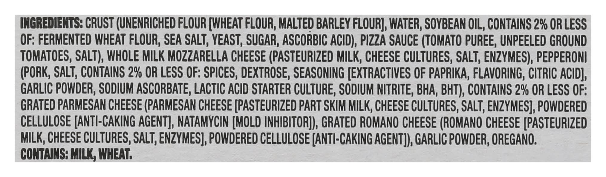 Ingredients: Crust (Unenriched Flour [Wheat Flour, Malted Barley Flour], Water, Soybean Oil, Contains 2% or Less of: Fermented Wheat Flour, Sea Salt, Yeast, Sugar, Ascorbic Acid), Pizza Sauce (Tomato Puree, Unpeeled Ground Tomatoes, Salt), Whole Milk Mozzarella Cheese (Pasteurized Milk, Cheese Cultures, Salt, Enzymes), Pepperoni (Pork, Salt, Contains 2% or Less of: Spices, Dextrose, Seasoning [Extractives of Paprika, Flavoring, Citric Acid], Garlic Powder, Sodium Ascorbate, Lactic Acid Starter Culture, Sodium Nitrite, BHA, BHT), Contains 2% or Less of: Grated Parmesan Cheese (Parmesan Cheese [Pasteurized Part Skim Milk, Cheese Cultures, Salt, Enzymes], Powdered Cellulose [Anti-Caking Agent], Natamycin [Mold Inhibitor]), Grated Romano Cheese (Romano Cheese [Pasteurized Milk, Cheese Cultures, Salt, Enzymes], Powdered Cellulose [Anti-Caking Agent]), Garlic Powder, Oregano Contains: Milk, Wheat, Barley, Soybeans