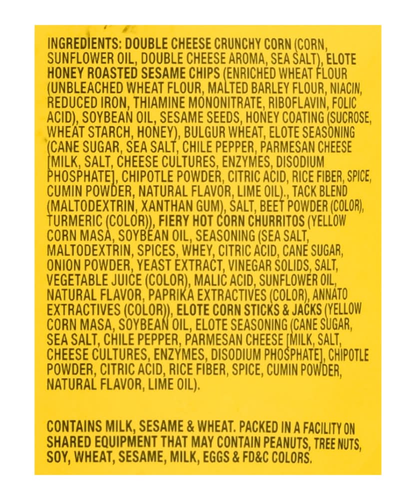 Ingredients: Double Cheese Crunchy Corn (Corn, Sunflower Oil, Double Cheese Aroma, Sea Salt), Elote Honey Roasted Sesame Chips (Enriched Wheat Flour (Unbleached Wheat Flour, Malted Barley Flour, Niacin, Reduced Iron, Thiamine Mononitrate, Riboflavin, Folic Acid), Soybean Oil, Sesame Seeds, Honey Coating (Sucrose, Wheat Starch, Honey), Bulgur Wheat, Elote Seasoning (Cane Sugar, Sea Salt), Chile Pepper, Parmesan Cheese, [Milk, Salt, Cheese Cultures, Enzymes, Disodium Phosphate], Chipotle Powder, Citric Acid, Rice Fiber, Spice Cumin Powder, Natural Flavor, Lime Oil), Tack Blend (Maltodextrin, Xanthan Gum), Salt, Beet Powder (Color), Turmeric (Color)), Fiery Hot Corn Churritos (Yellow Corn Masa, Soybean Oil, Seasoning (Sea Salt, Maltodextrin, Spices, Whey, Citric Acid, Cane Sugar Onion Powder, Yeast Extract, Vinegar Solids, Salt, Vegetable Juice (Color), Malic Acid, Sunflower Oil, Natural Flavor, Paprika Extractives (Color), Annato, Extractives (Color)), Elote Corn Sticks & Jacks (Yellow Corn Masa, Soybean Oil, Elote Seasoning (Cane Sugar Sea Salt, Chile Pepper, Parmesan Cheese [Milk, Salt Cheese Cultures, Enzymes, Disodium Phosphate], Chipotle Powder, Citric Acid, Rice Fiber, Spice, Cumin Powder Natural Flavor, Lime Oil) Contains: Milk, Sesame, Corn, Soybeans, Barley, Wheat, Peanuts, Tree Nuts, Soybeans, Wheat, Sesame, Milk, Eggs