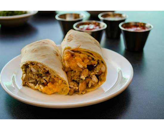 Pork, tomatillos, pinto beans, white rice, cheddar cheese, green chile peppers, jalapeno peppers, yellow onions, lime juice, green tomatillo salsa wrapped in a flour tortilla. SERVED CHILLED - REHEAT RECOMMENDED